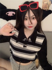 Sweet and spicy striped Polo collar short sweater women's autumn 2022 new design loose drawstring long-sleeved top ショート ロング 大人ガーリー スウィート キュート カジュアル オータム 秋物 ストライプ 0921978712905142