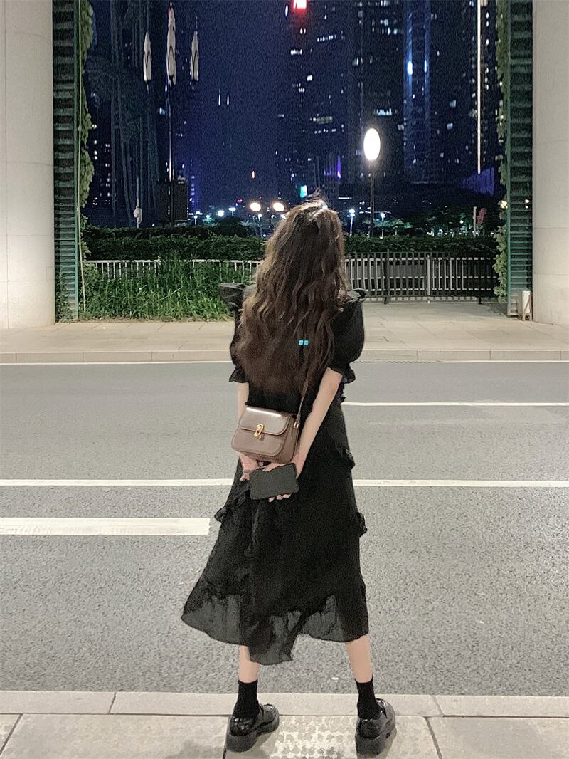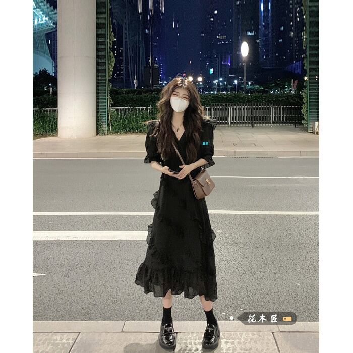 sense niche ruffled black V-neck dress women's summer 2022 new temperament waist A-line skirt skirt ブラック サマー 夏物 スカート Vネック Aライン 0921930900777659