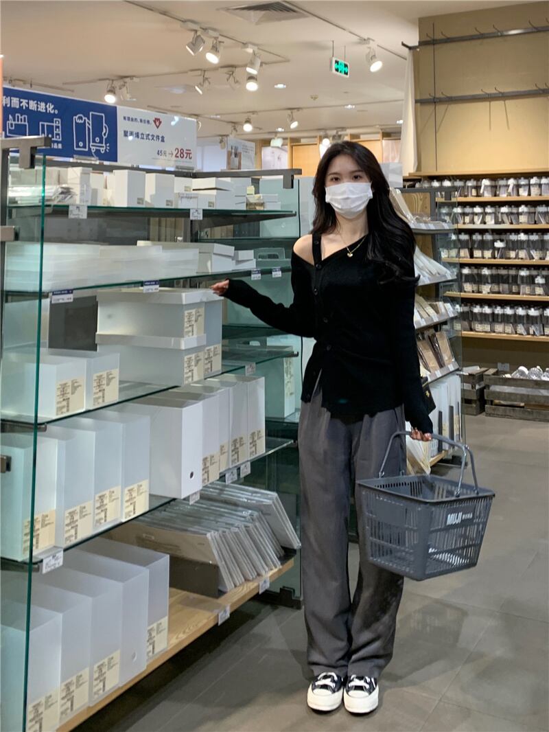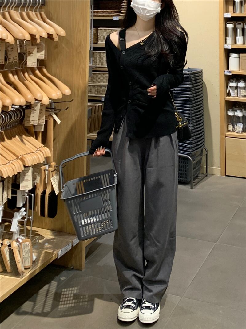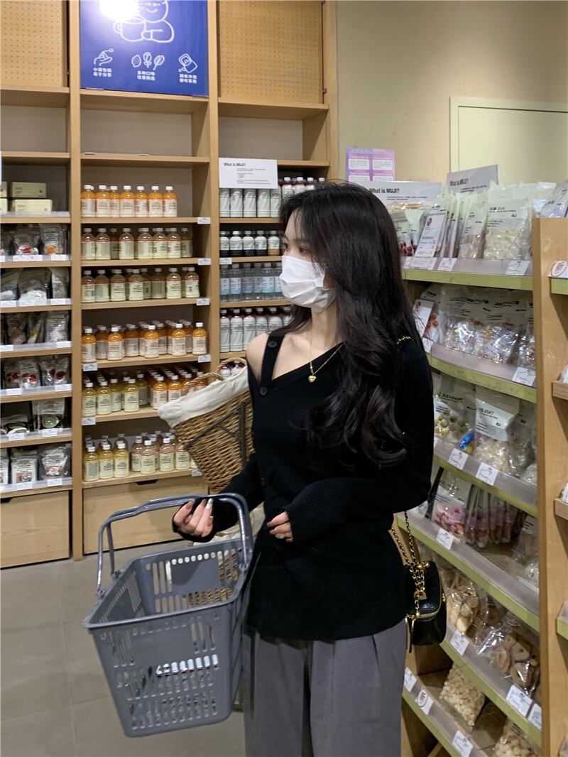 sense chic temperament off-the-shoulder black long-sleeved sweater women's autumn 2022 new pleated slim top trend ロング ブラック プリーツ オータム 秋物 スリム 0921939066569820