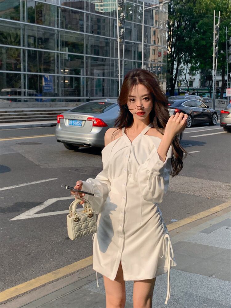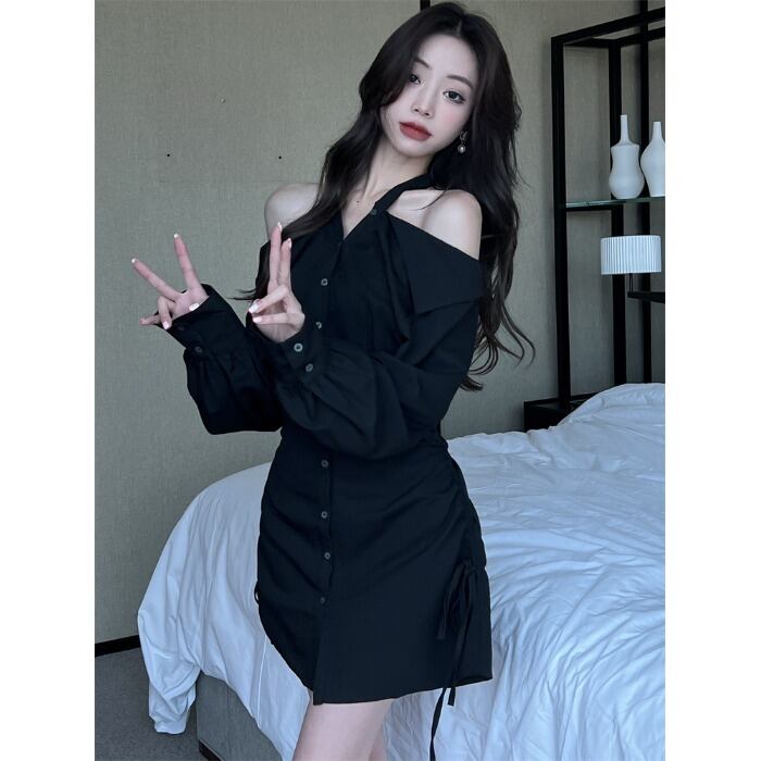 French chic temperament niche off-the-shoulder long-sleeved dress women's autumn 2022 new design halter shirt skirt ロング オータム 秋物 スカート 0921935371771846