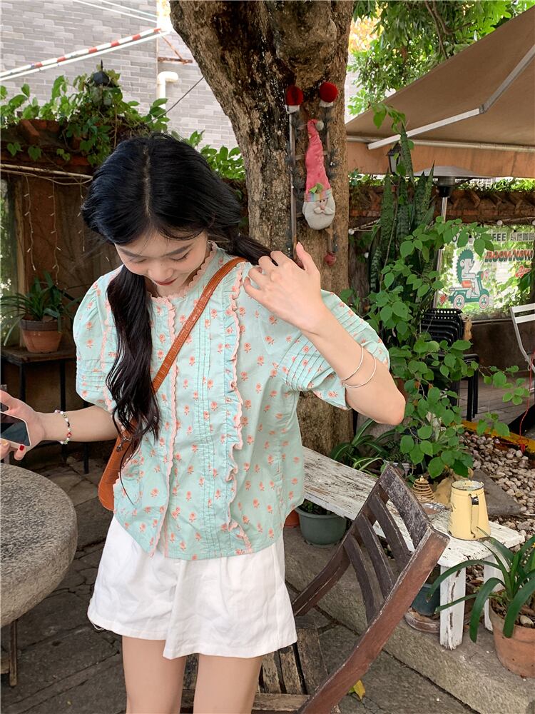 sweet fungus edge floral shirt women's summer 2022 new chic puff sleeve loose top trendy 大人ガーリー スウィート キュート カジュアル サマー 夏物 花柄 0921928301364417