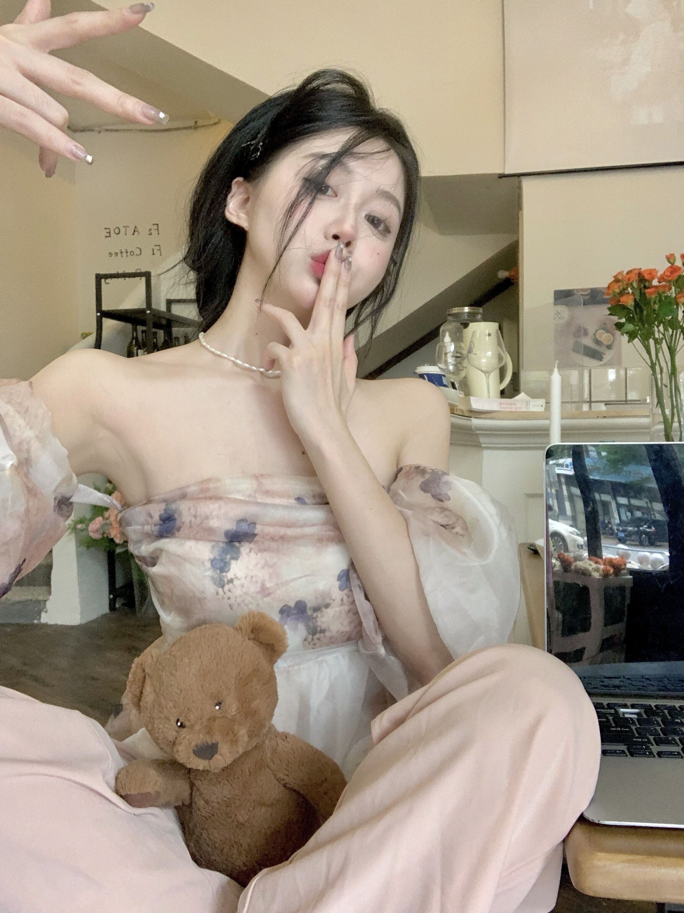 Sweet and gentle wind floral puff sleeve shirt women's summer 2022 new one-shoulder short slim tube top top ショート 大人ガーリー スウィート キュート カジュアル サマー 夏物 花柄 スリム 0921973258028237