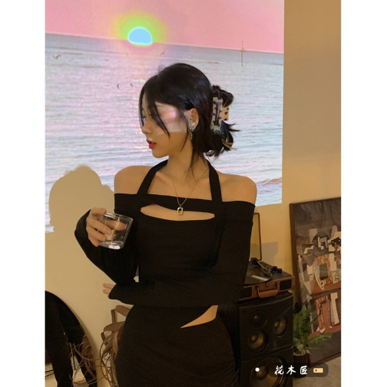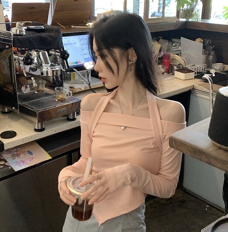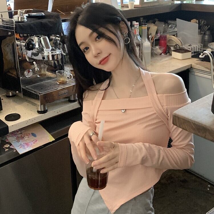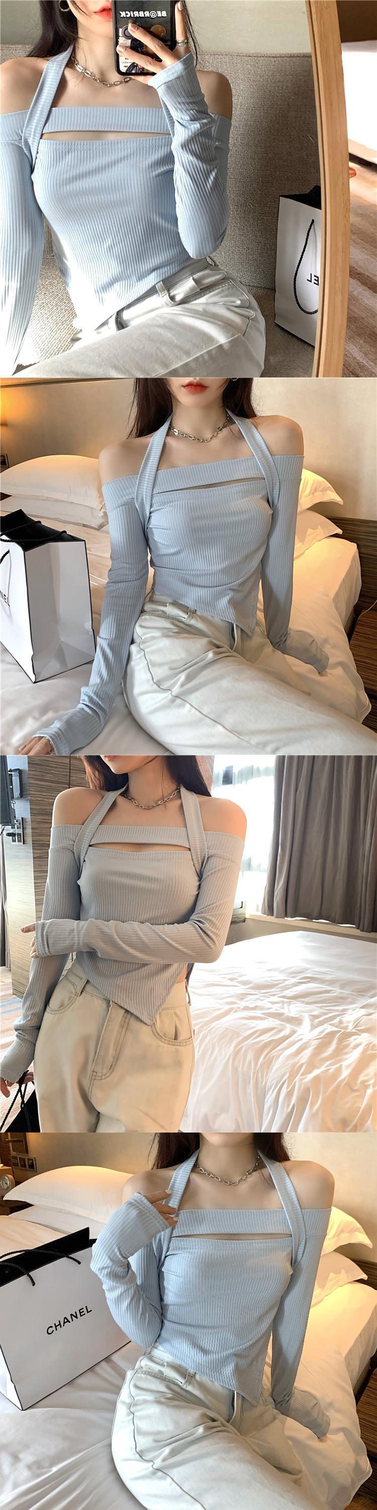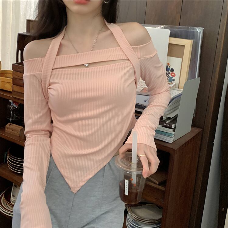 Pure Desire Hot Girl Off-the-shoulder halter-neck black long-sleeved T-shirt women's autumn 2022 new irregular short slim top ショート ロング ブラック オータム 秋物 スリム Tシャツ 0921985861232264
