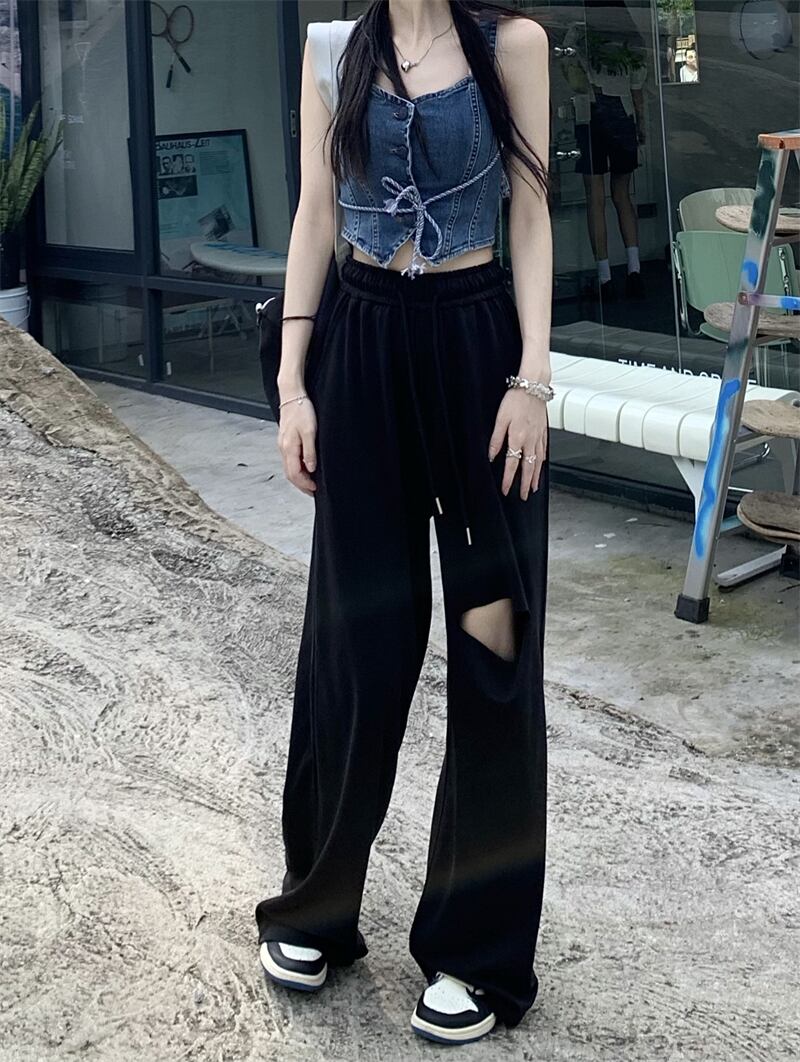 sense hole black casual pants women's autumn 2022 new all-match drawstring high waist thin loose wide leg pants ハイウェスト ブラック カジュアル オータム 秋物 ワイドレッグ ワイドパンツ 0921936874058667