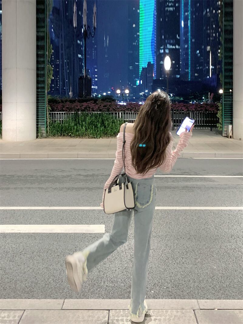 Sweet and spicy style careful machine off-the-shoulder long-sleeved T-shirt women's autumn 2022 new style contrast color striped slim one-shoulder top ロング 大人ガーリー スウィート キュート カジュアル オータム 秋物 ストライプ スリム Tシャツ 0921930946799253