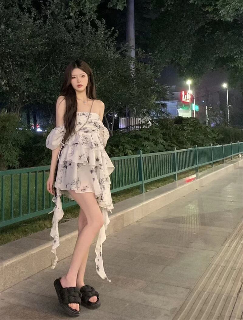 -quality printing irregular puff sleeve dress female summer 2022 new fairy temperament waist cake skirt サマー 夏物 スカート 0921992735377433