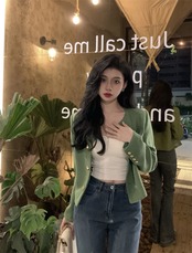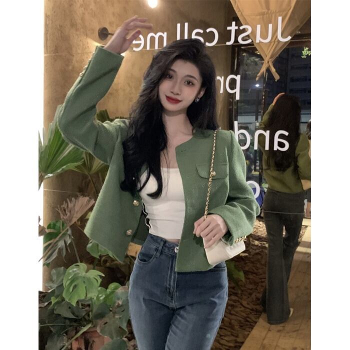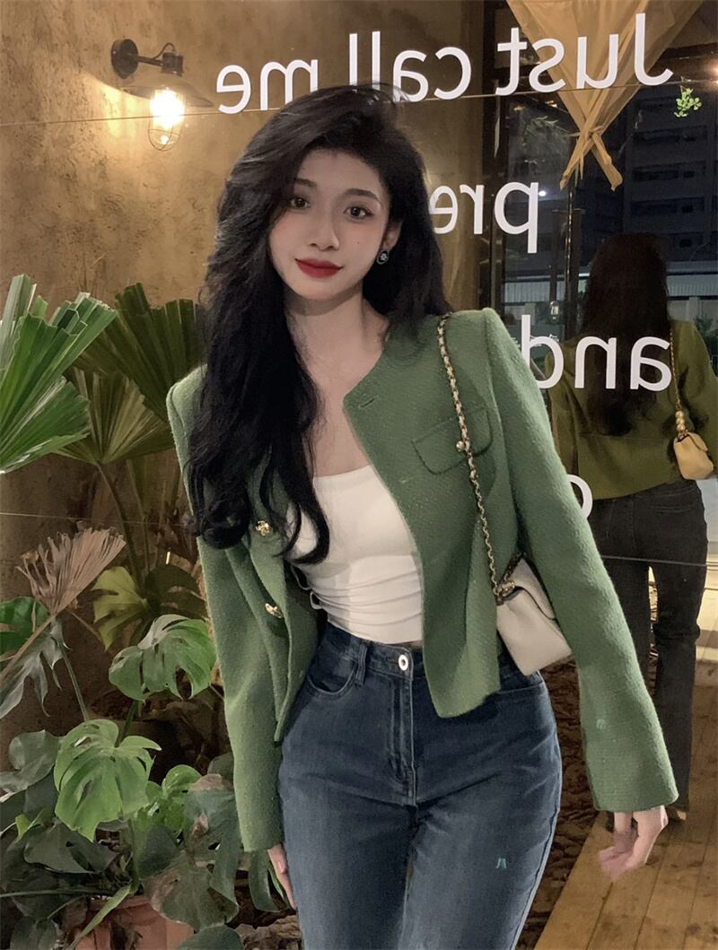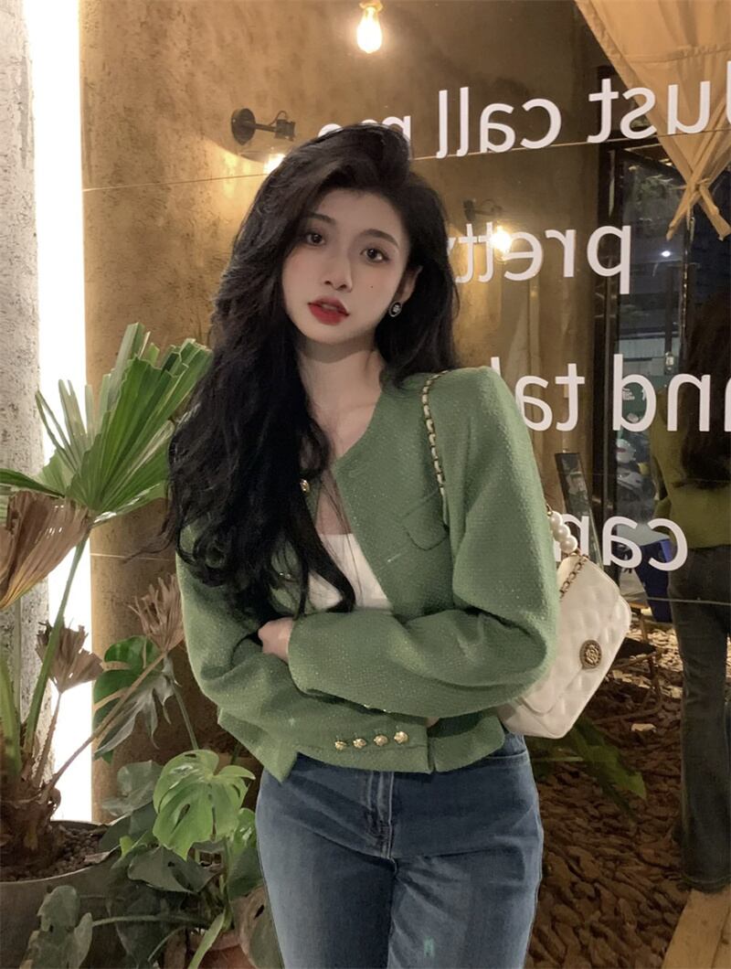 -quality niche green short small fragrance coat women's autumn 2022 new design temperament cardigan top ショート カーディガン オータム 秋物 グリーン 0921953623546565