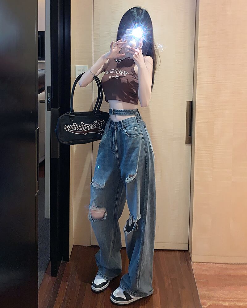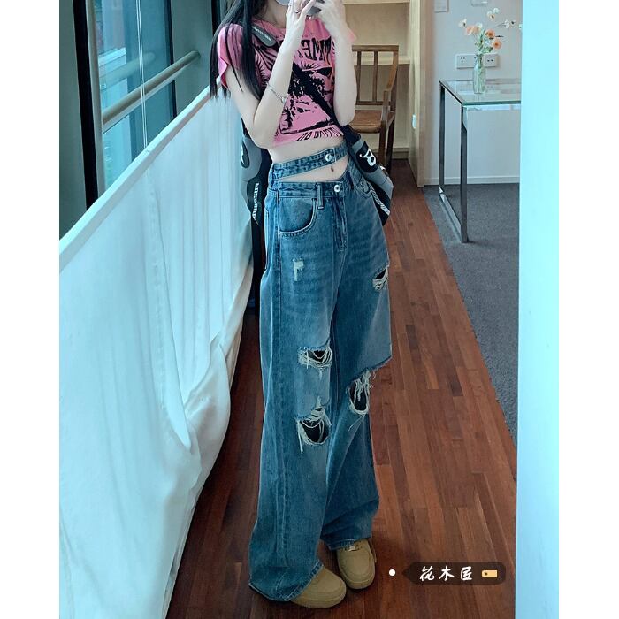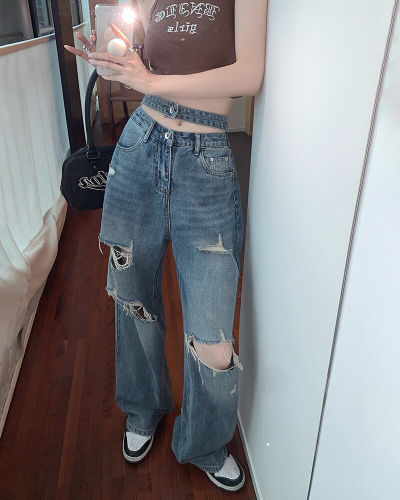 Hot ripped jeans women's autumn straight loose wide-leg pants design sense hollowed out waist mopping pants trousers オータム 秋物 0921937406637663