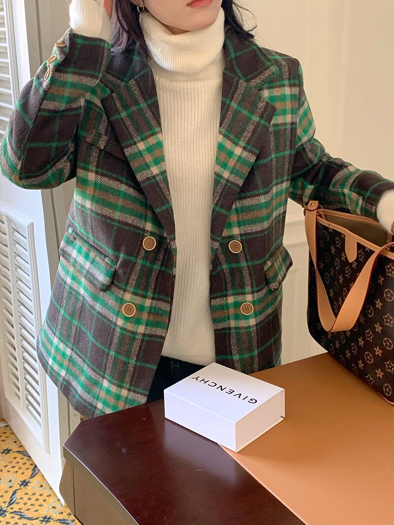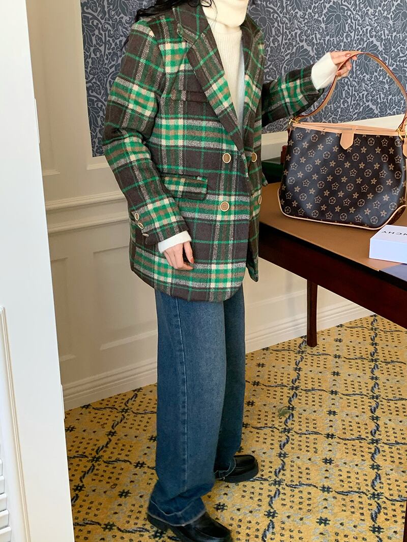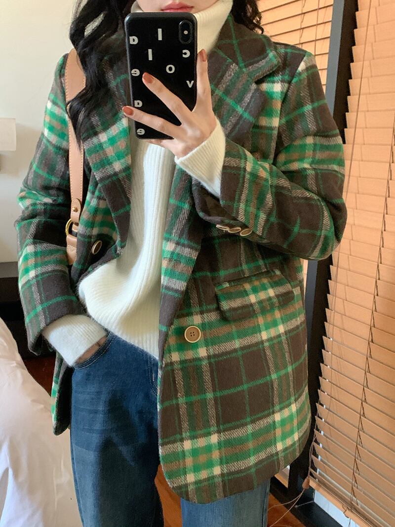retro contrast color plaid suit jacket women's autumn 2022 new mid-length loose woolen suit jacket レトロ オータム 秋物 0921939972724259