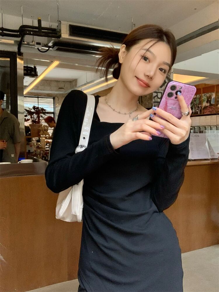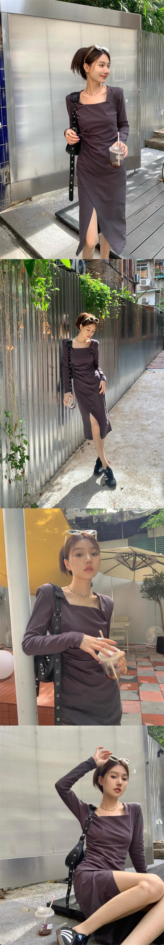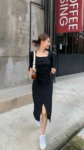 sense of temperament square neck slit long-sleeved dress women's autumn 2022 new chic pleated waist bag hip skirt ロング プリーツ オータム 秋物 スカート スクウェア 0921982729962438
