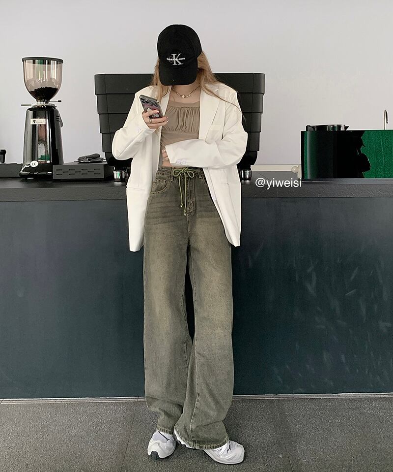 American retro high street ins drawstring jeans women's autumn 2022 new design high waist straight mopping pants ハイウェスト レトロ ストリート オータム 秋物 0921910820887055