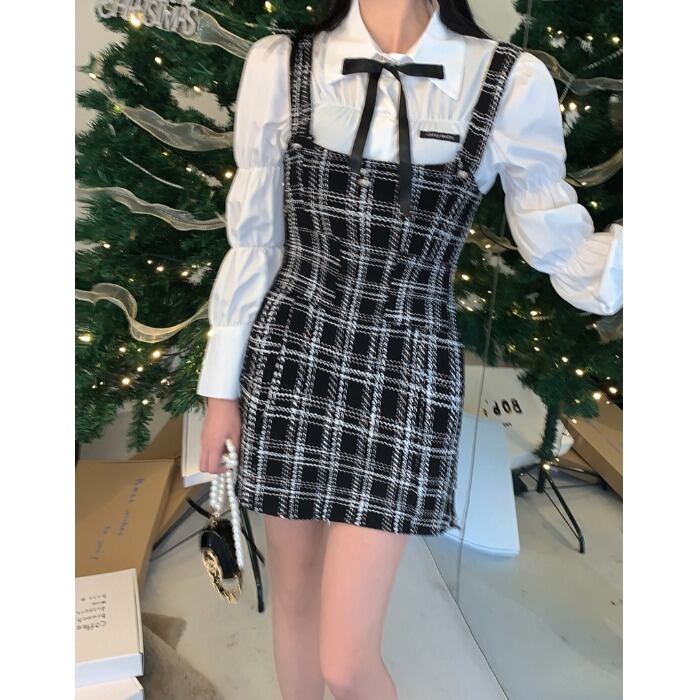 simple temperament fashion suit skirt women's autumn 2022 new white shirt plaid strap skirt two-piece suit ホワイト オータム 秋物 スカート 0921988838236912