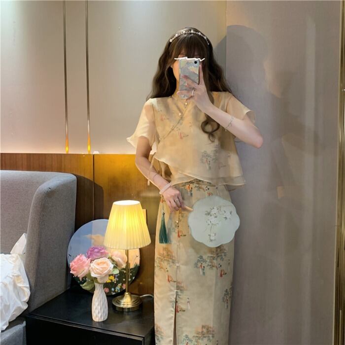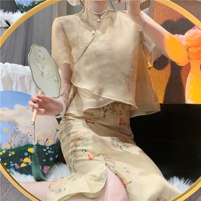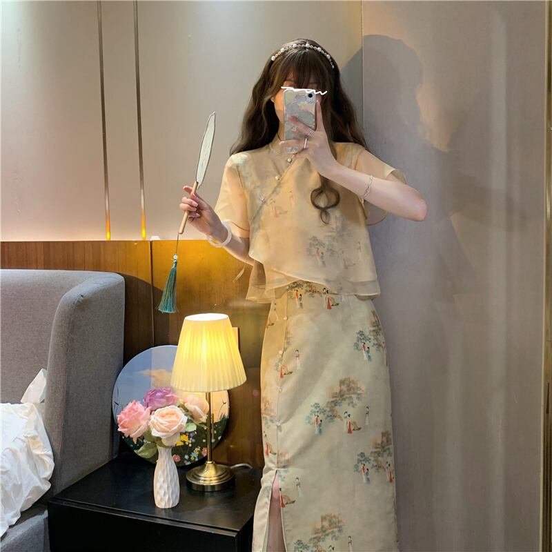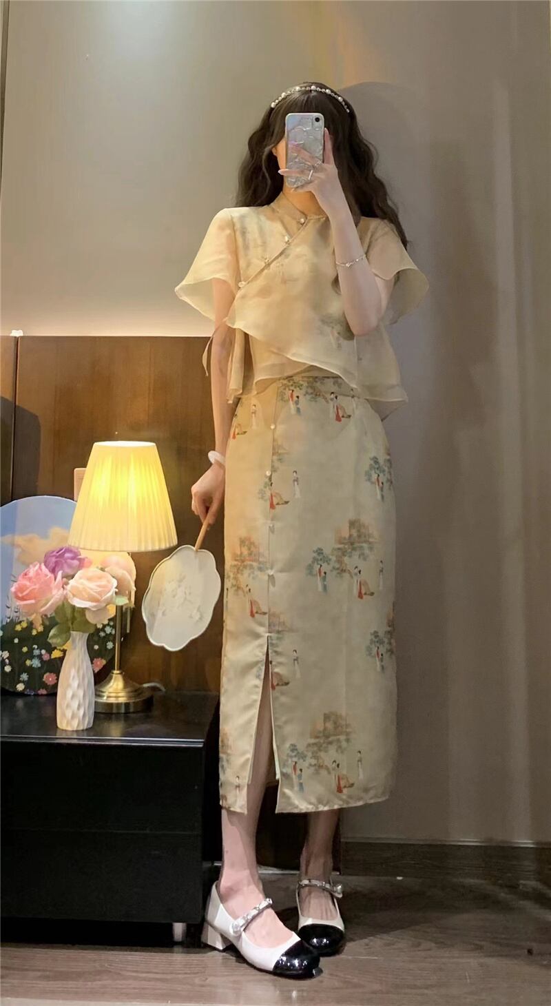 National style new Chinese suit female summer 2022 new temperament stand-up collar waist mid-length split half skirt two-piece set サマー 夏物 スカート 09219706083905