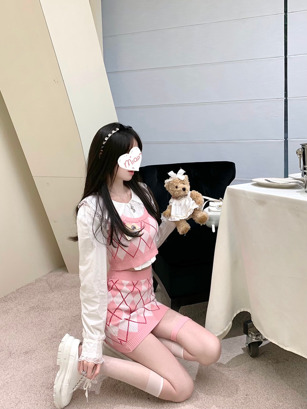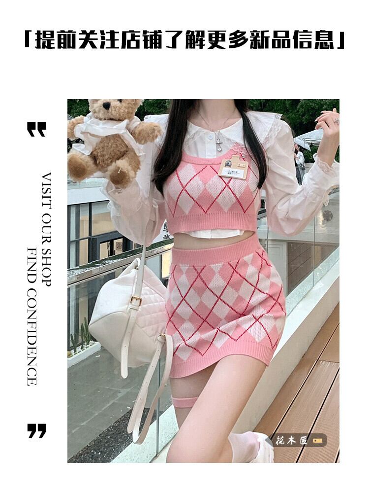 Retro college style suit female autumn 2022 new rhombus knitted vest skirt lace shirt three-piece set レトロ レース オータム 秋物 スカート 0921996539898882
