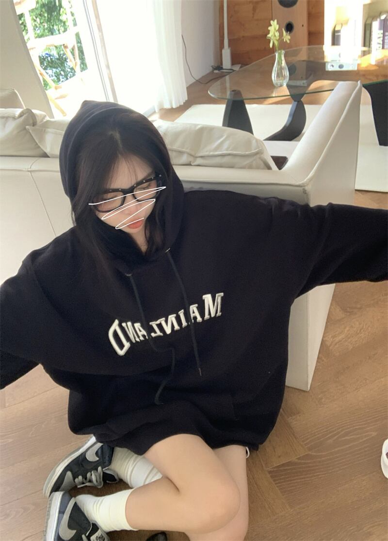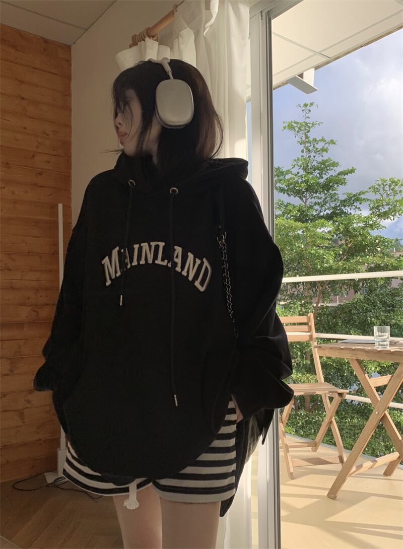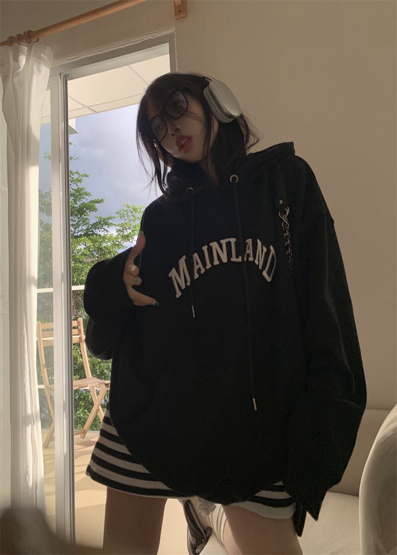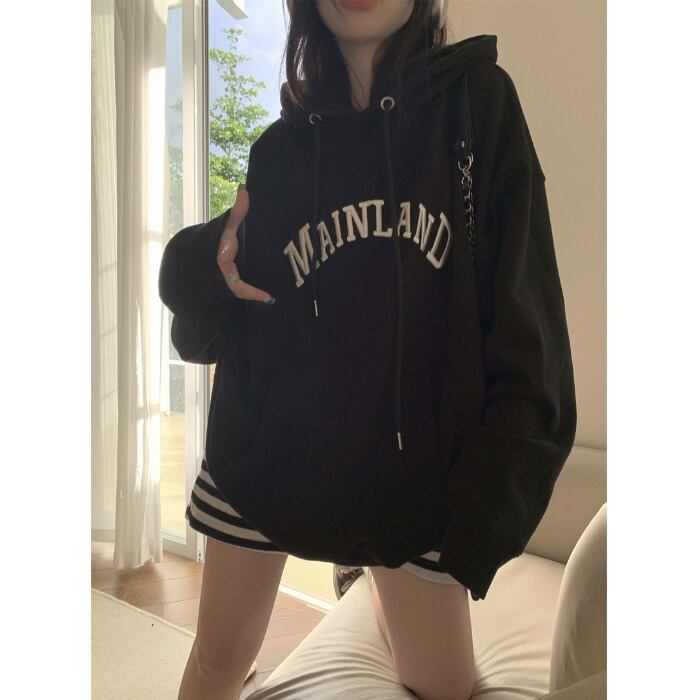 version of the simple letter embroidery black hooded sweater women's autumn 2022 new chic loose mid-length top ブラック 刺繍 オータム 秋物 0921919048575920