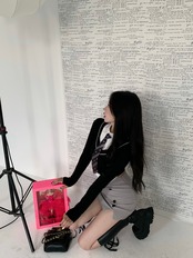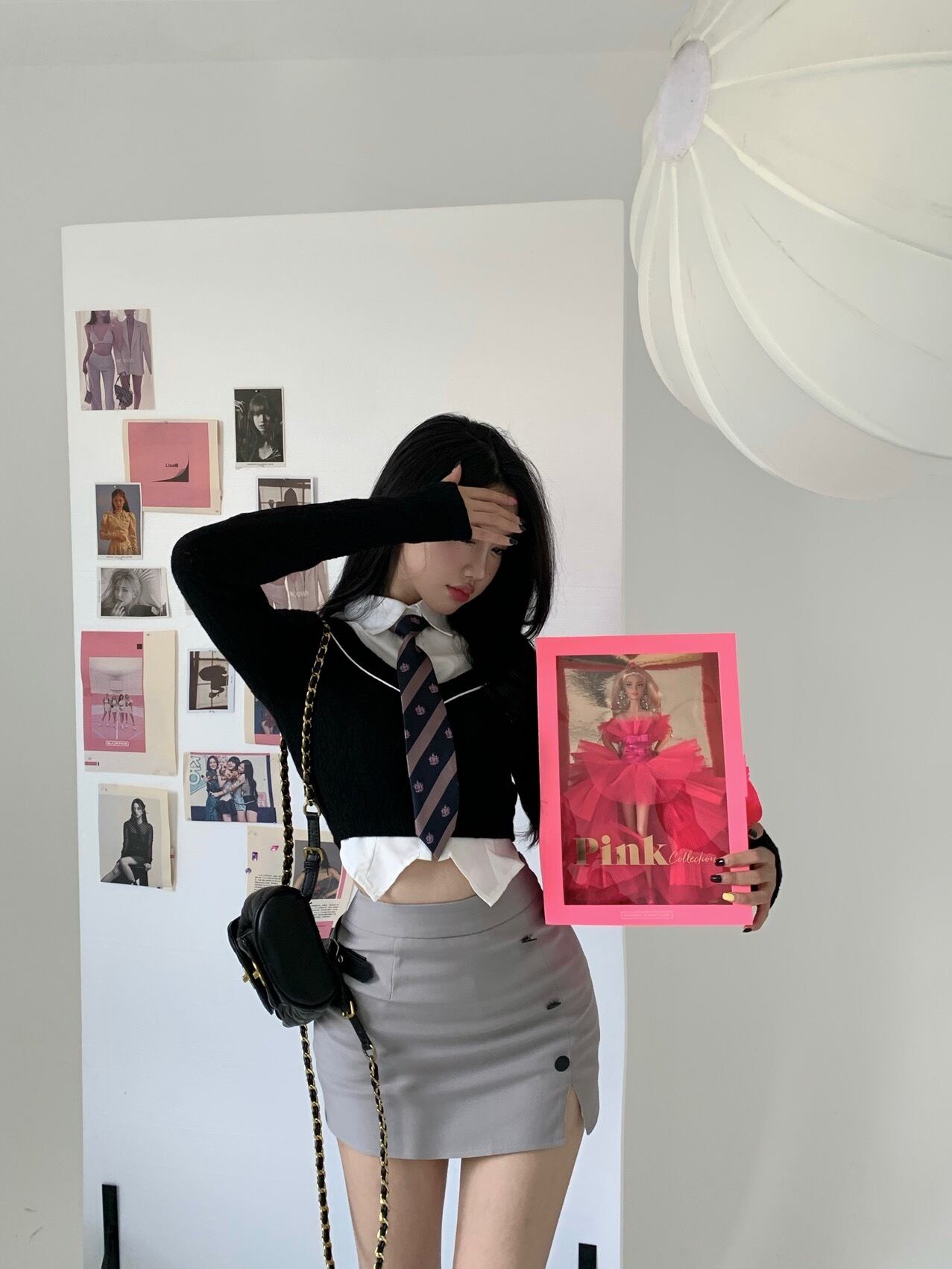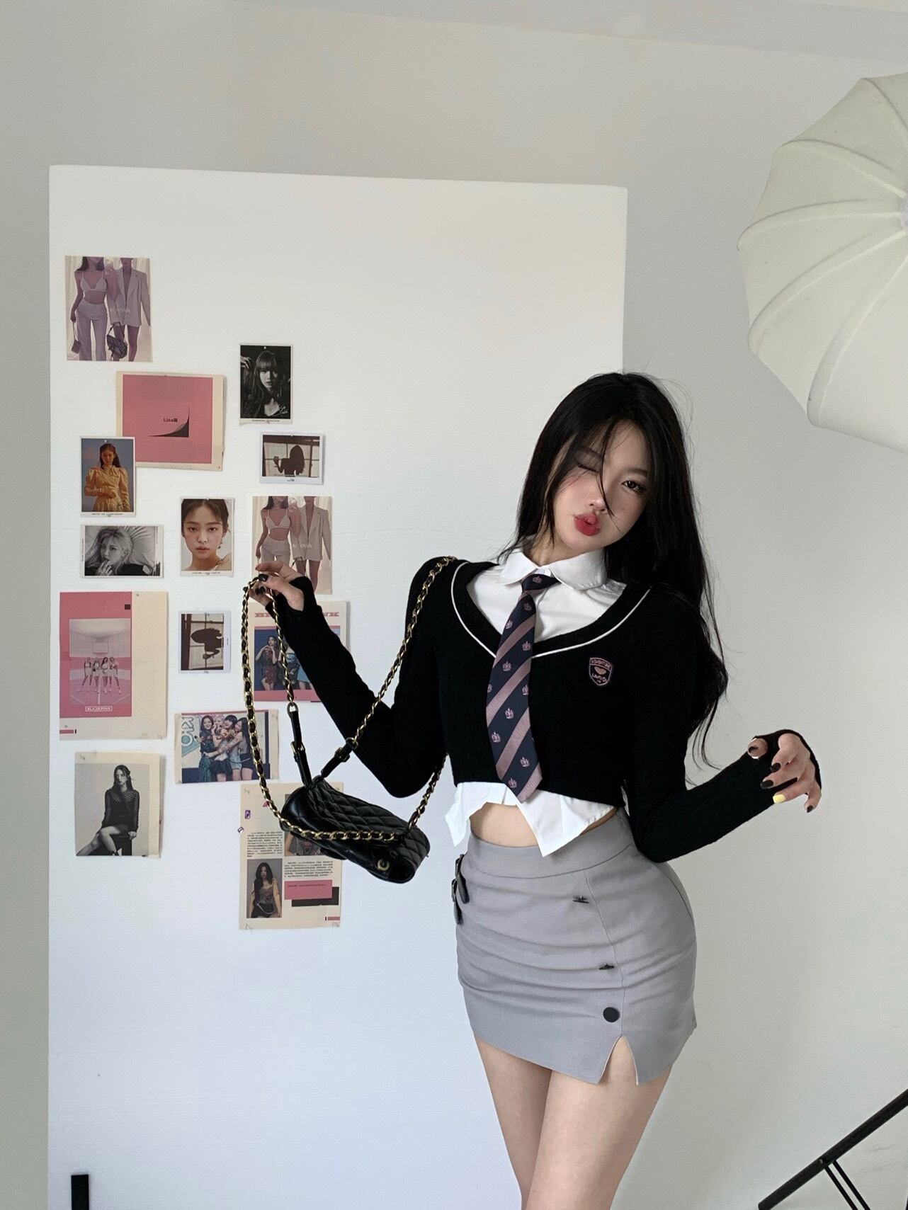 韓国のカレッジ風秋の女性のスーツ黒ニットシャツ年齢を減らすシャツ分割バッグヒップスカート 3 点セット ブラック オータム 秋物 092191763147047