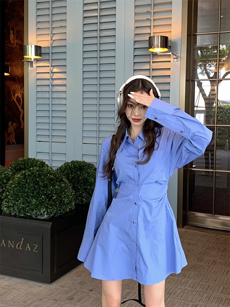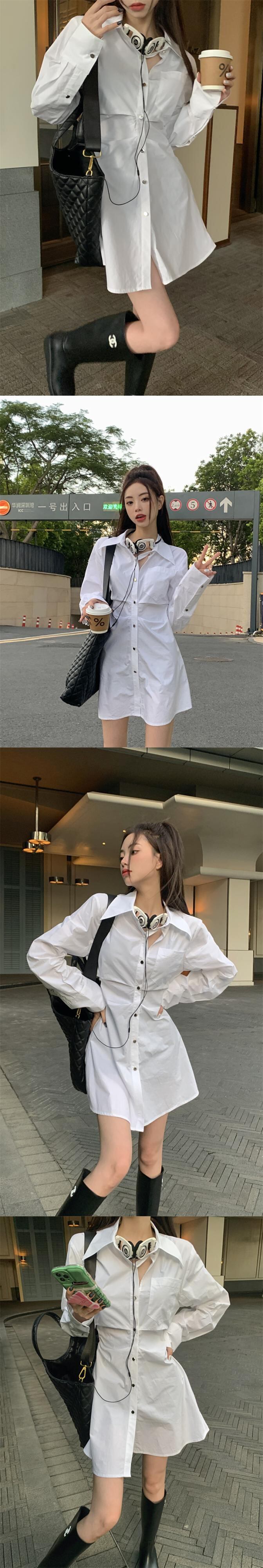 version of the design sense long-sleeved white shirt dress women's autumn 2022 new all-match temperament waist A-line skirt ロング ホワイト オータム 秋物 スカート Aライン 0921987672396509