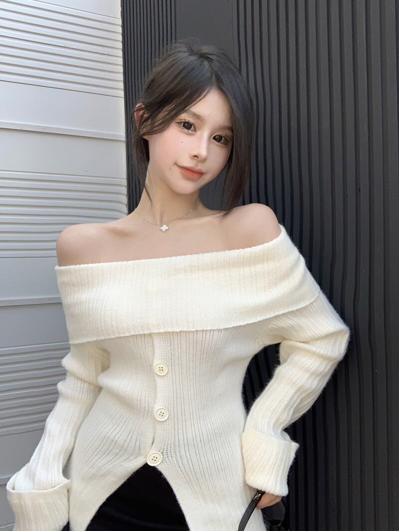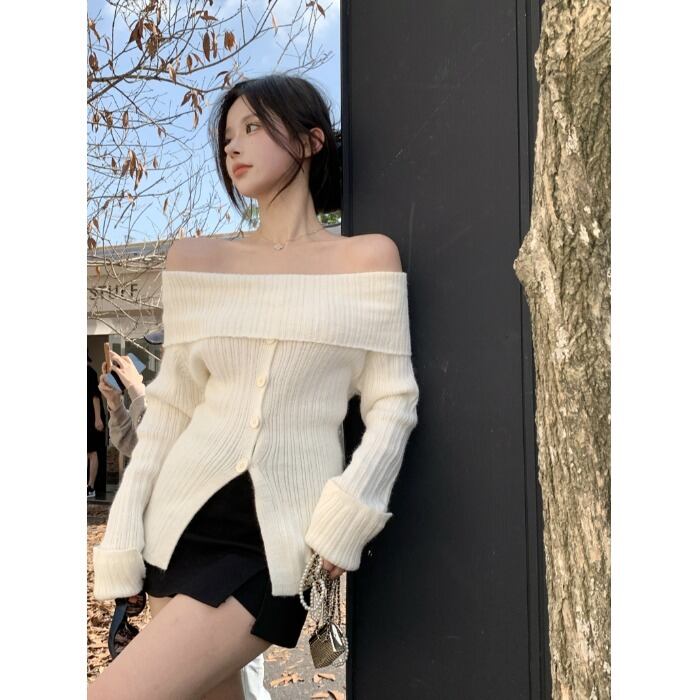 Pure desire style sexy one-shoulder long-sleeved knitted sweater women's autumn 2022 new gentle wind soft waxy chic sweater ロング オータム 秋物 0921972433113762