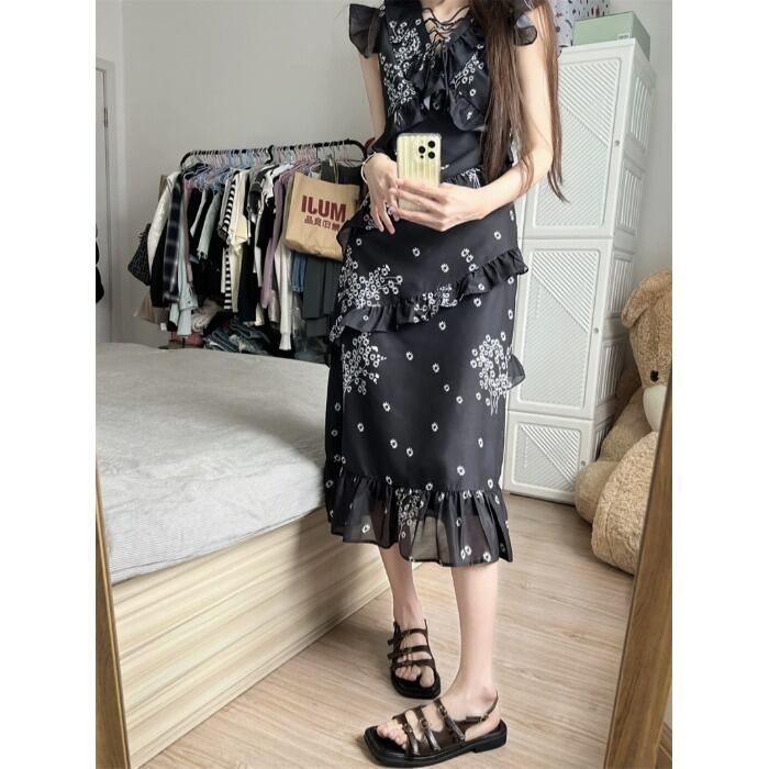 -quality chic flying sleeve dress women's summer 2022 new design sense straps temperament waist A-line skirt サマー 夏物 スカート Aライン 0921956105286306