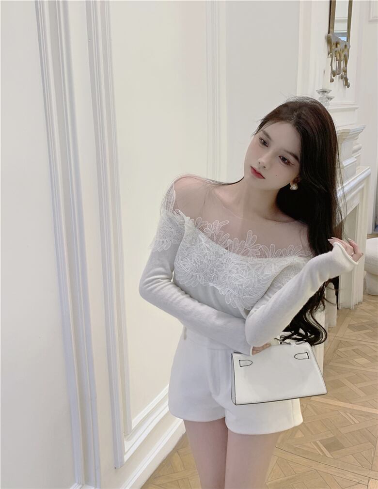 Sexy one-shoulder stitching lace long-sleeved sweater women's autumn 2022 new gentle style slim top ロング レース オータム 秋物 スリム ステッチ 0921977100059118