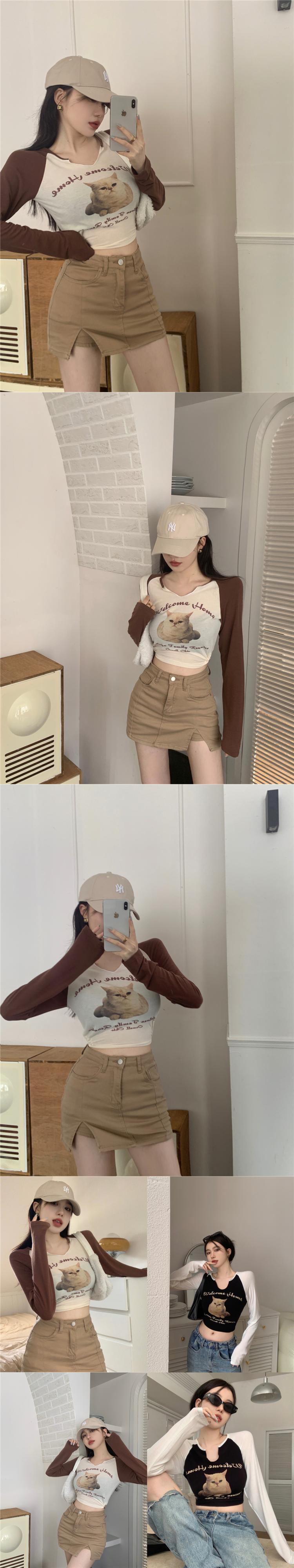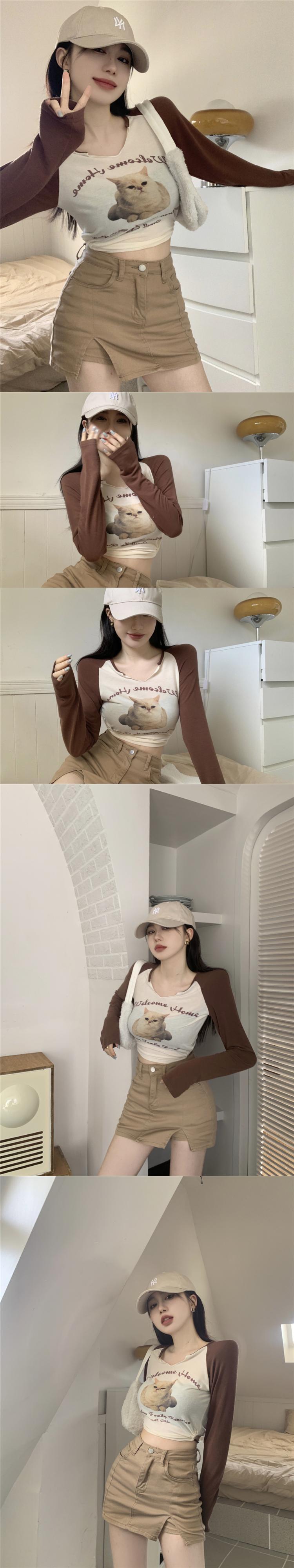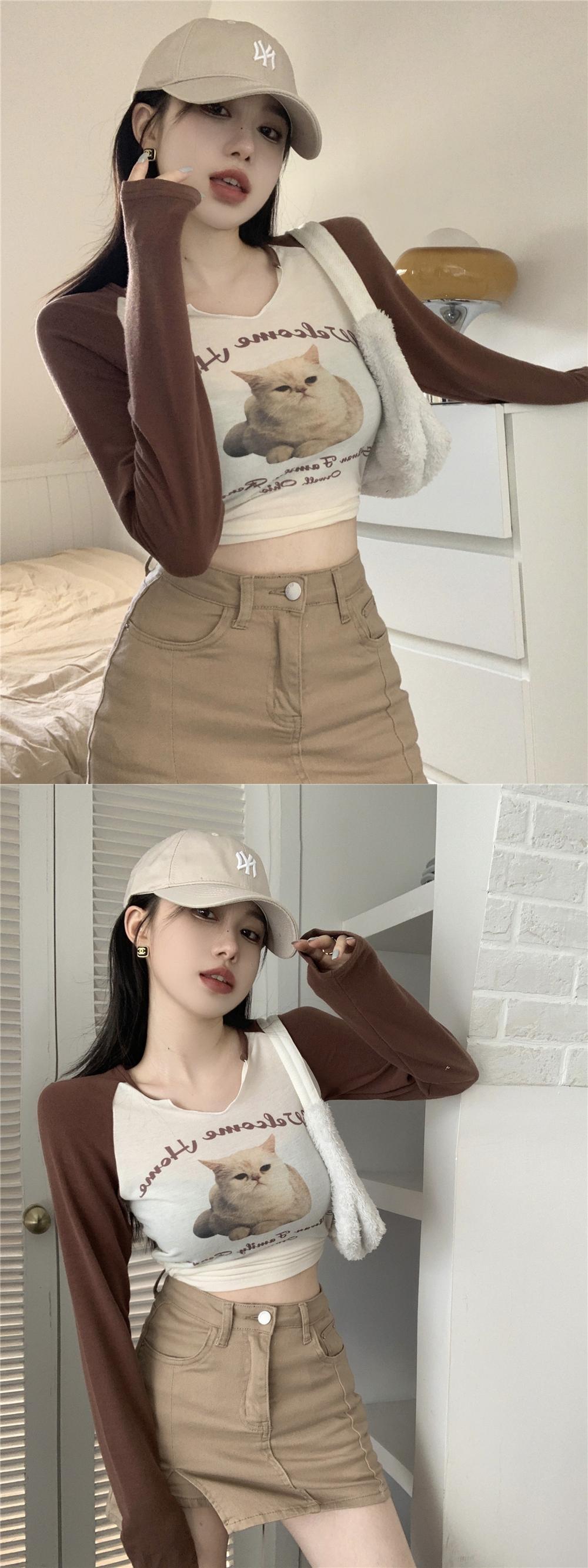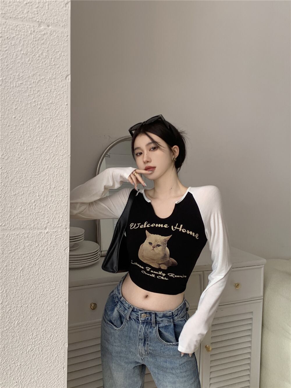 Sweet and spicy cat print contrast color long-sleeved T-shirt women's autumn 2022 new retro slim short top ショート ロング レトロ 大人ガーリー スウィート キュート カジュアル オータム 秋物 スリム Tシャツ 0921925171477409