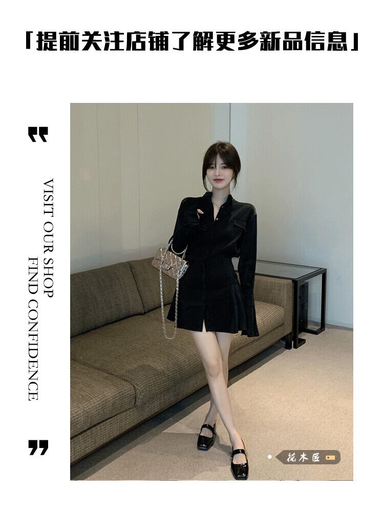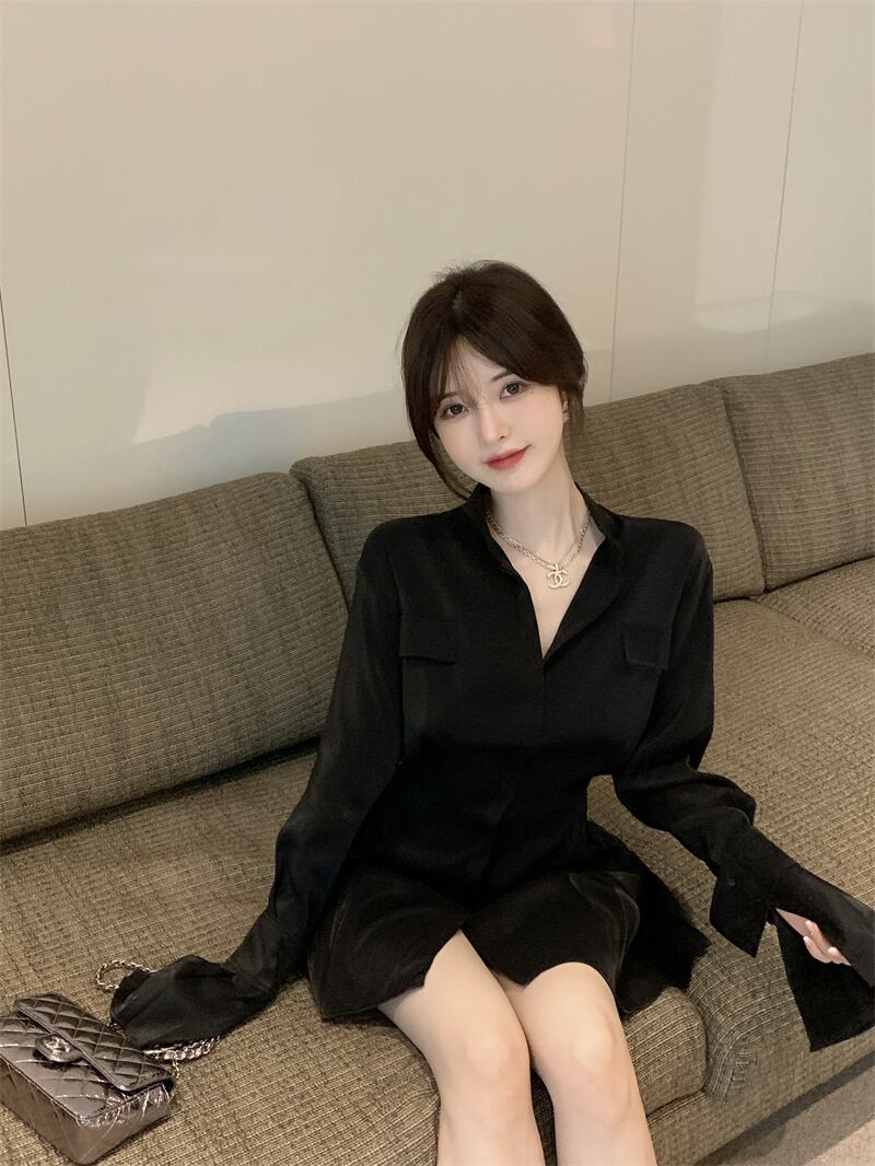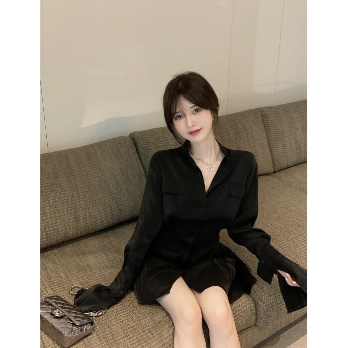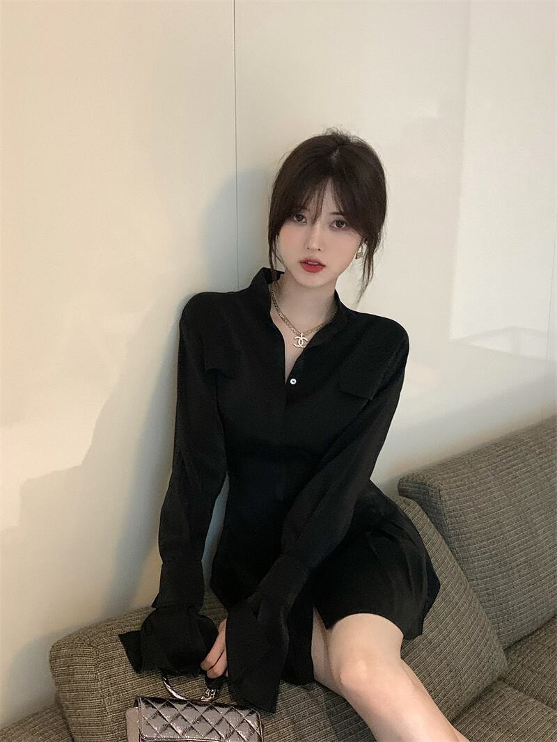 -quality temperament black long-sleeved shirt dress women's autumn 2022 new waist and thin A-line skirt ロング ブラック オータム 秋物 スカート Aライン 0921964091748097