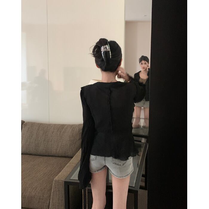 sense niche ruffled long-sleeved T-shirt women's autumn 2022 new sunscreen shirt slim-fit lace-up cardigan top ロング レース カーディガン オータム 秋物 Tシャツ レースアップ 0921919511568401