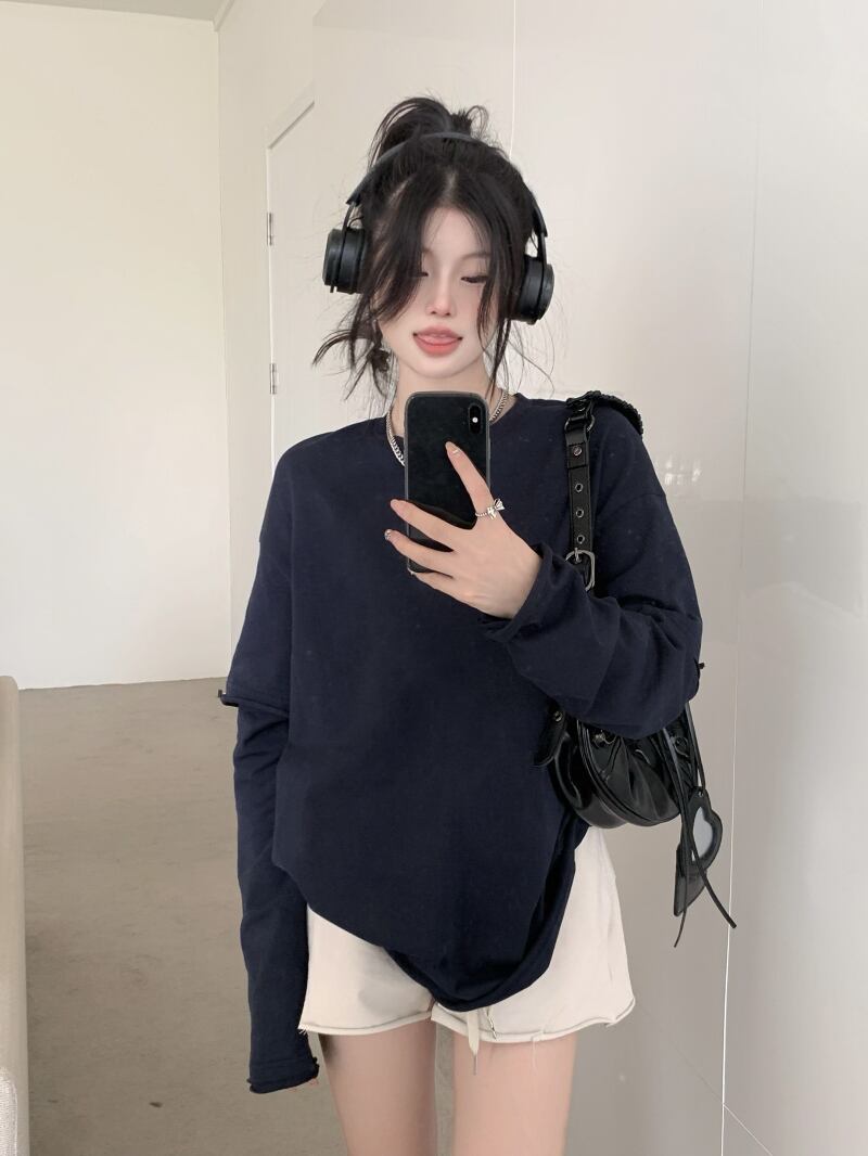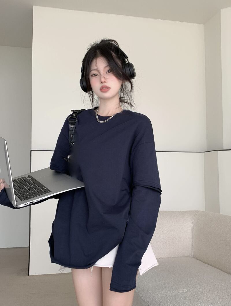 アメリカのファッションフェイクツーピースプリントプルオーバーセーター女性の 2022 年秋新しい怠惰なスタイルルーズミッドレングストップ オータム 秋物 0921999186587183
