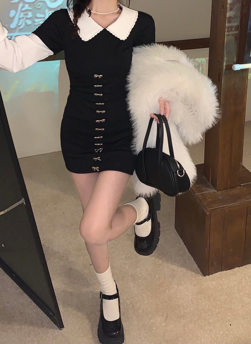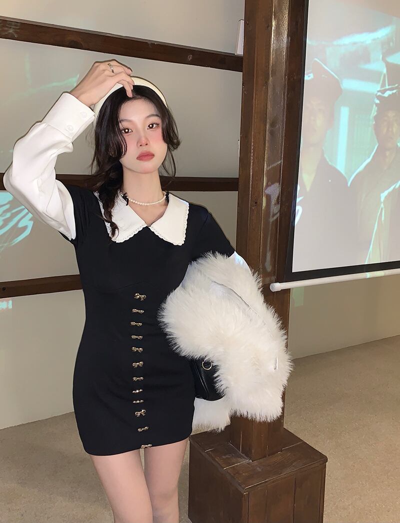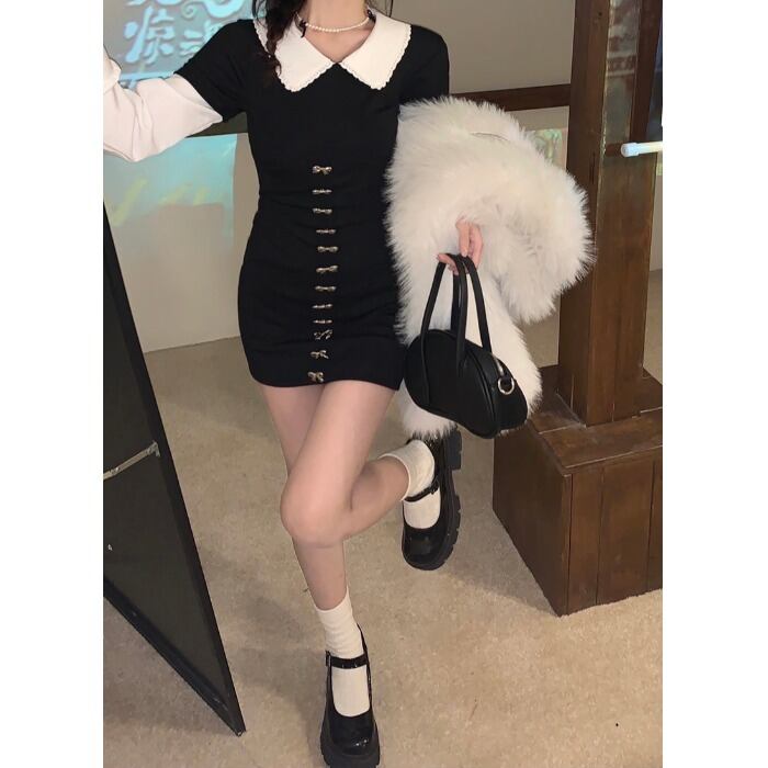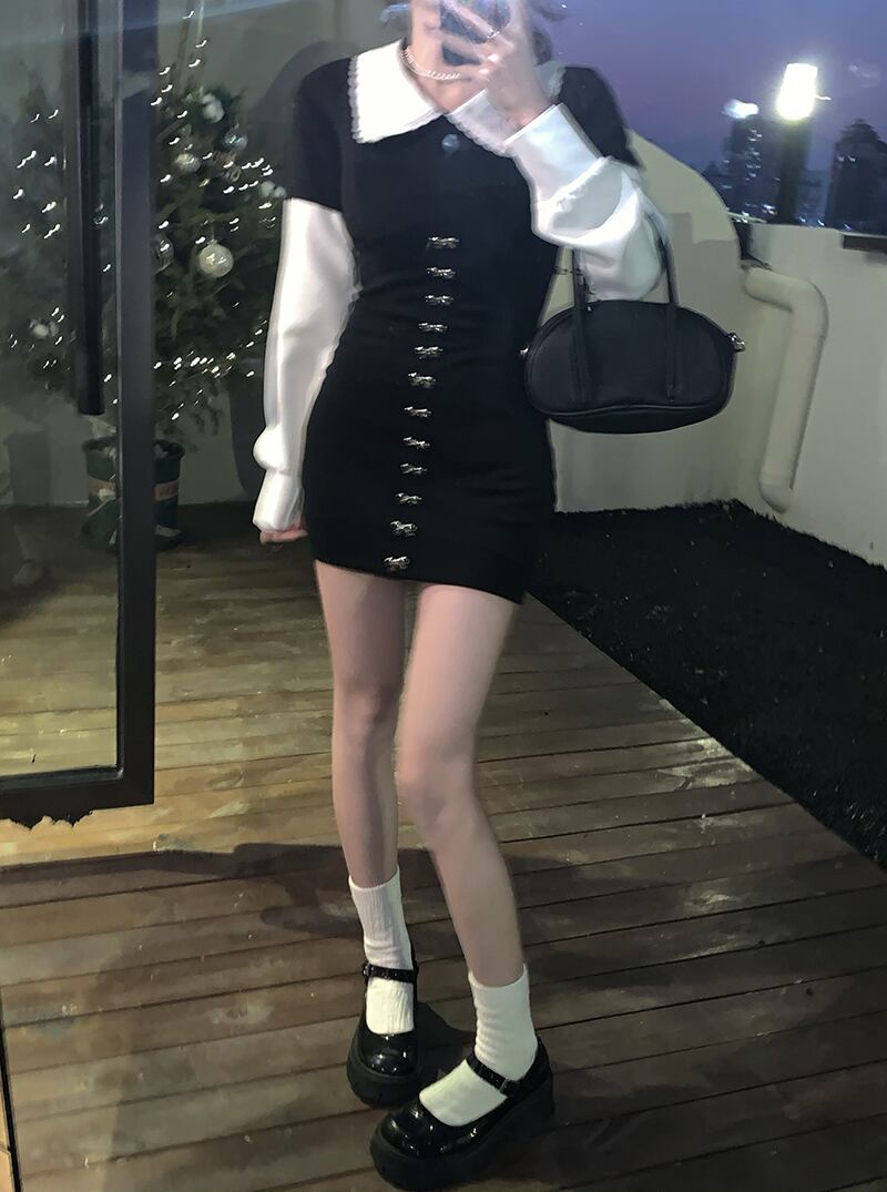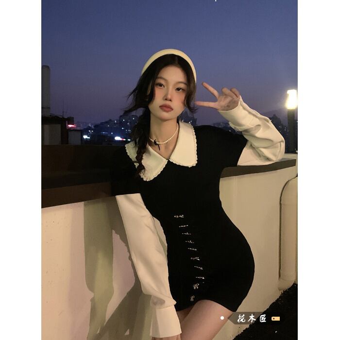 甘くてスパイシーな純粋な欲望の自己修養コントラストカラーステッチフェイクツーピースドレス女性の2022年秋の新しい気質痩身ヒップスカート 大人ガーリー スウィート キュート カジュアル オータム 秋物 ピュア 0921986391265639