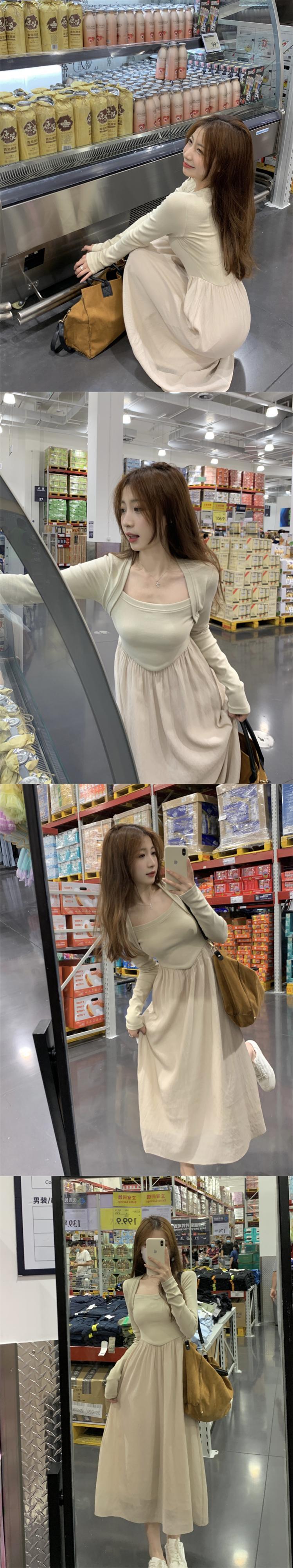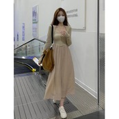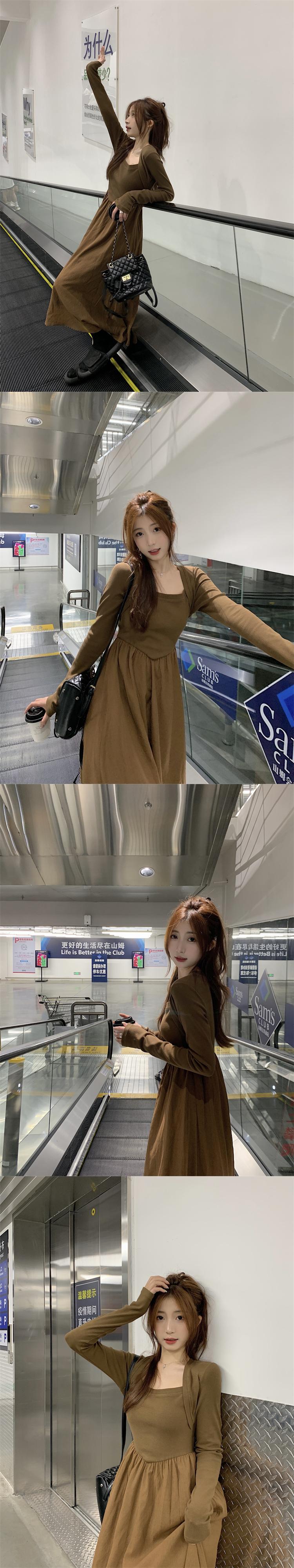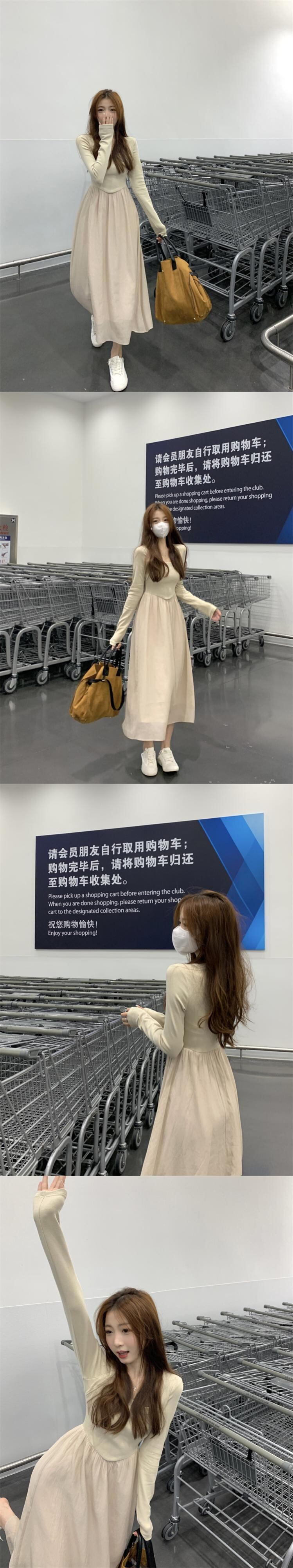 フランスの優しいスタイルのステッチ長袖ドレスの女性の秋の新しい腰丈の薄いロングスカートの気質のカジュアルなスカート オータム 秋物 0921993640601922