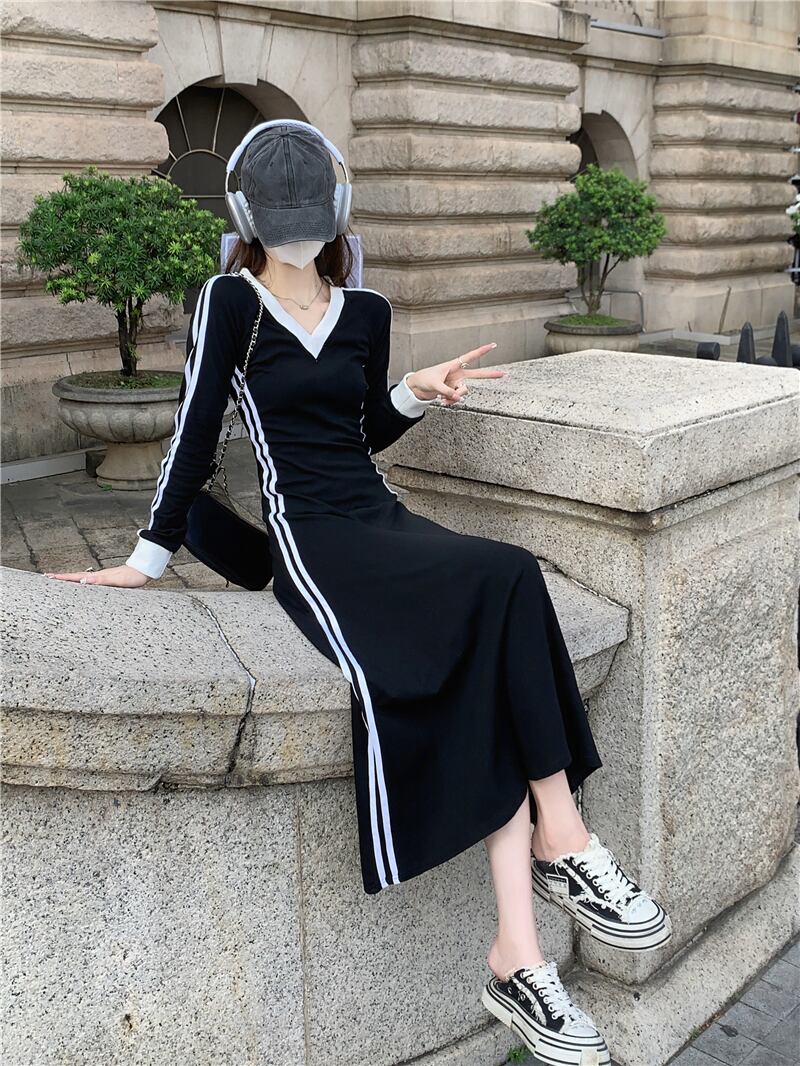 上品なコントラストカラーVネック長袖ワンピース レディース 2022年秋新作 シックなコントラストカラーストライプ ミドル丈スカート ロング オータム 秋物 0921980395976764