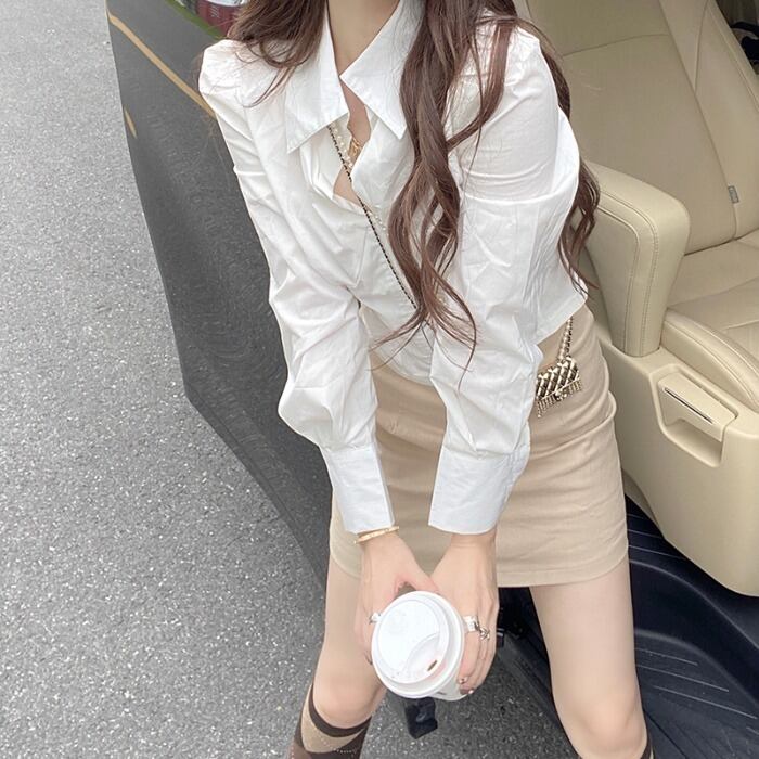 デザインセンスニッチ気質プリーツ白シャツ女性の初秋 2022 新しいホットガールシックな薄いショートトップ ホワイト オータム 秋物 0921997932741910