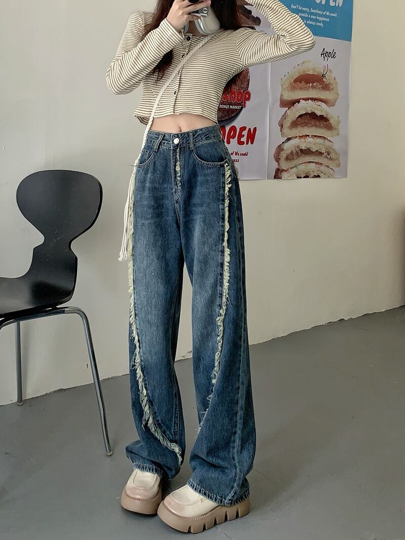 デザインセンスステッチ生エッジストレートジーンズレディース2022年秋新作ハイウエストゆったり薄手ワイドレッグロングパンツ ハイウェスト オータム 秋物 ワイドパンツ 0921987316975811