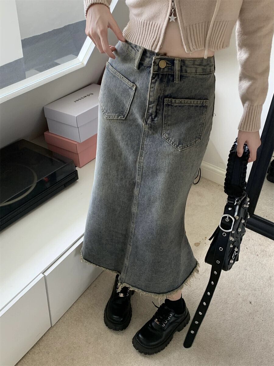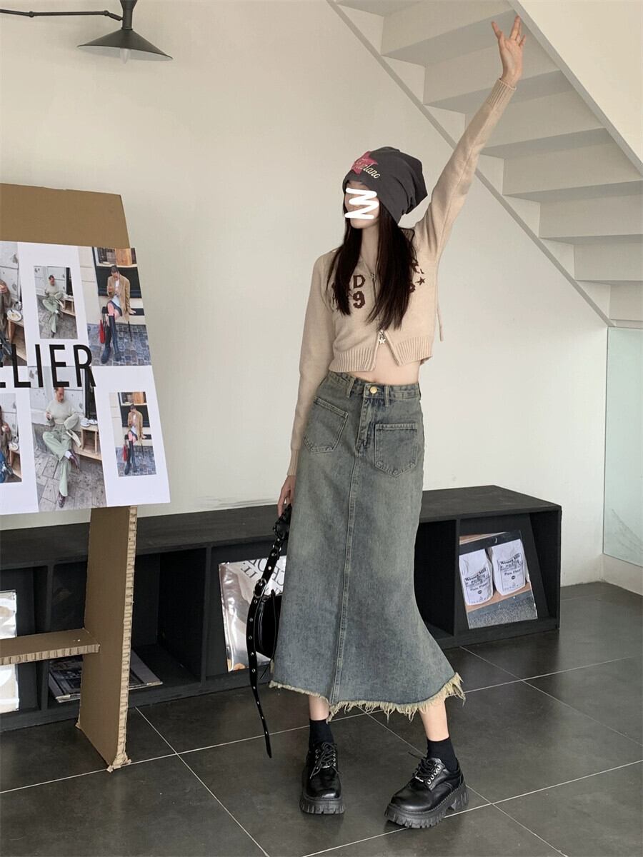 レトロデザインローエッジデニムスカート女性の春と秋 2023 新しいオールマッチハイウエストニッチ A ラインフィッシュテールスカート ハイウェスト スプリング 春物 オータム 秋物 Aライン 0921926244012783