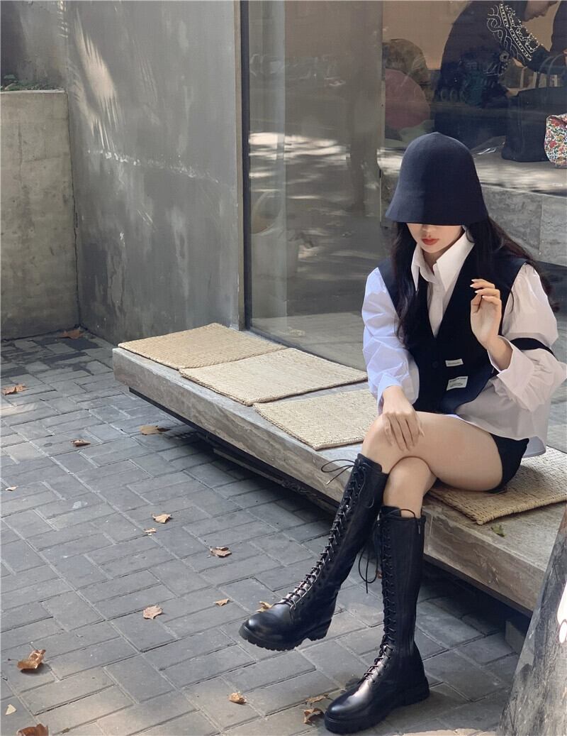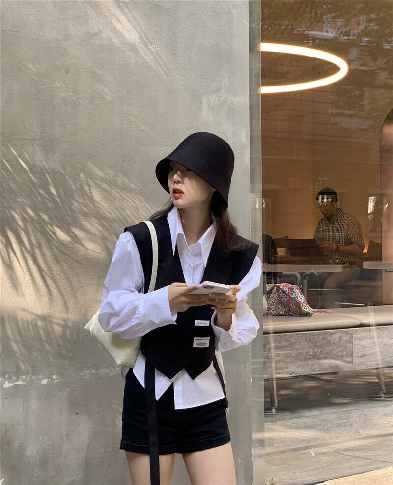 -エンドフライストリートファッションスーツ女性2023春の新しい黒のVネックベスト白シャツツーピースイン ホワイト ブラック スプリング 春物 0921930649324786