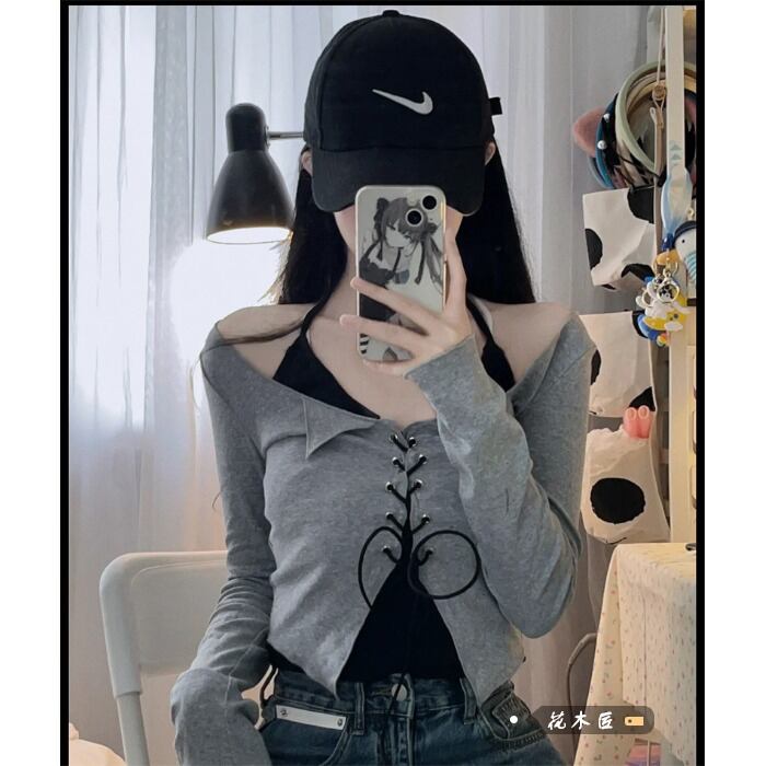 ホット謀略ストラップ薄いカーディガン長袖 Tシャツ女性の 2023 春の新デザインセンス気質スリムトップ ロング スプリング 春物 0921967947534850