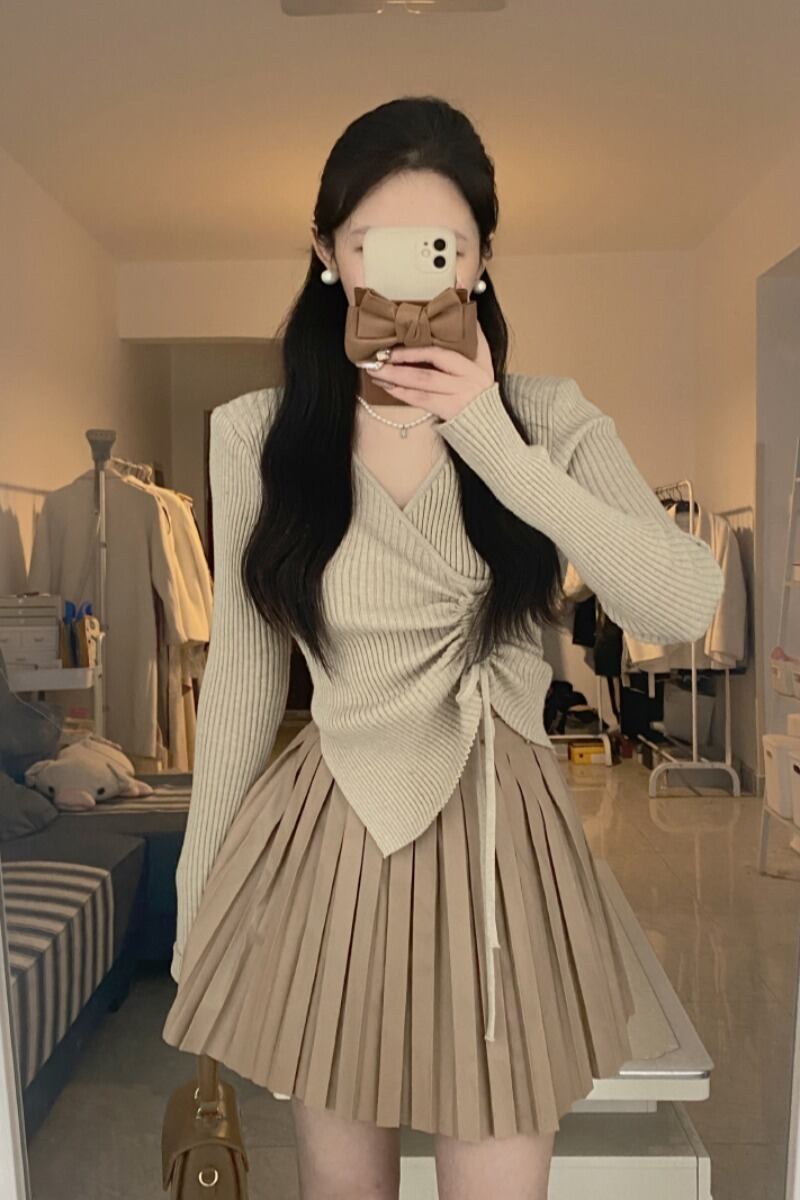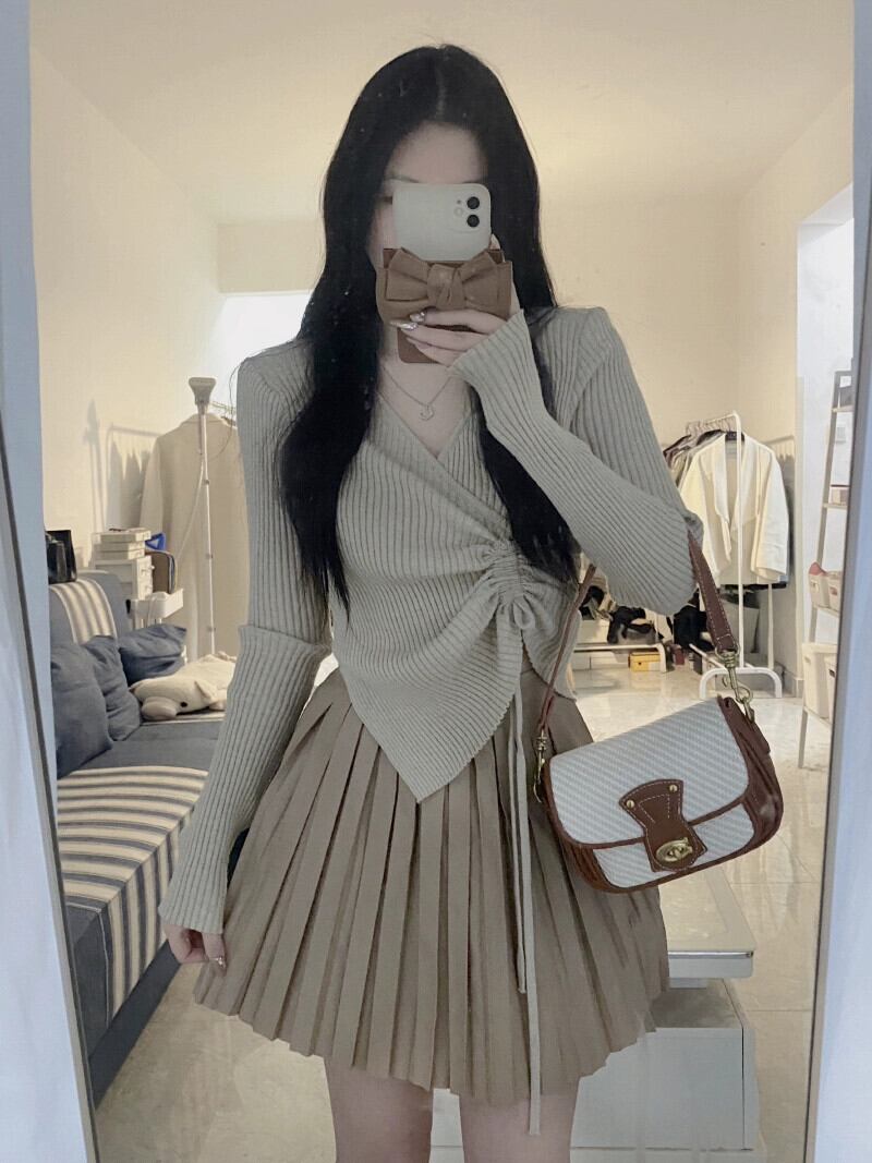 センスドローストリング不規則な長袖ニットセーターレディース2023春の新しい気質薄いオールマッチVネックトップ ロング スプリング 春物 0921926826752793