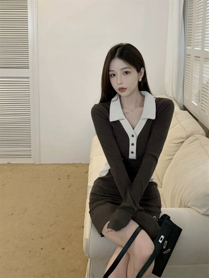 Spice Girl スパイスガール ポロカラー ステッチ 長袖ドレス レディース 2023 春 万能 スリム スリム ニットドレス ロング スプリング 春物 0921928798563741