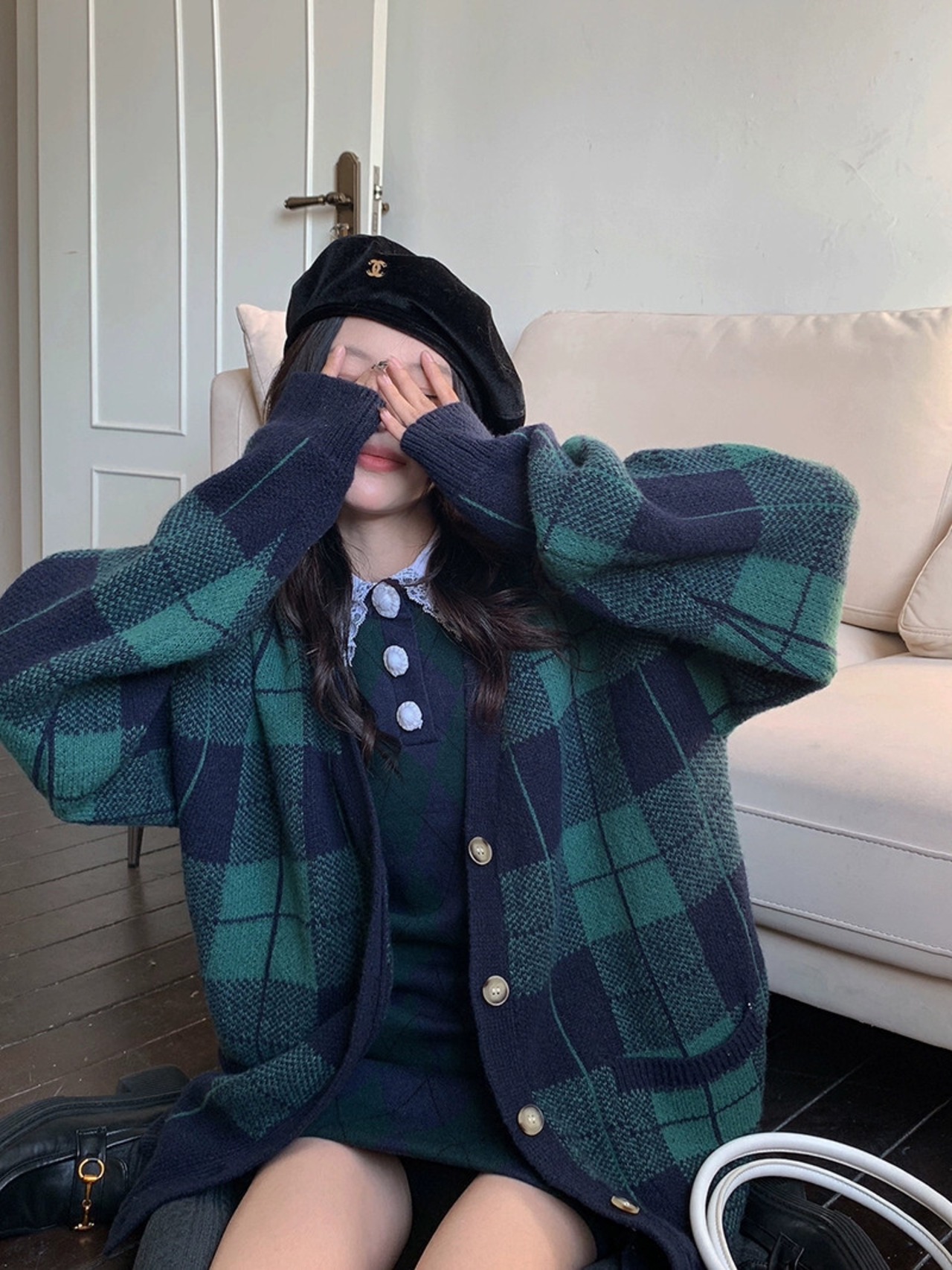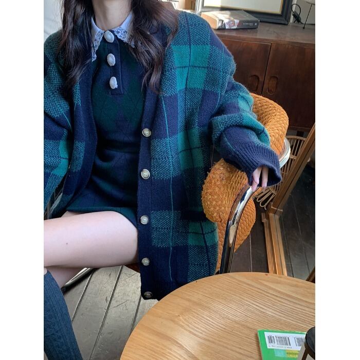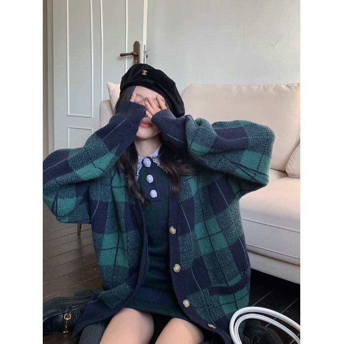 緩いレイジーウィンドヒットカラーチェック柄セータージャケットのバージョンの女性の春の2023新しいレトロオールマッチニットカーディガン スプリング 春物 0921937138906252