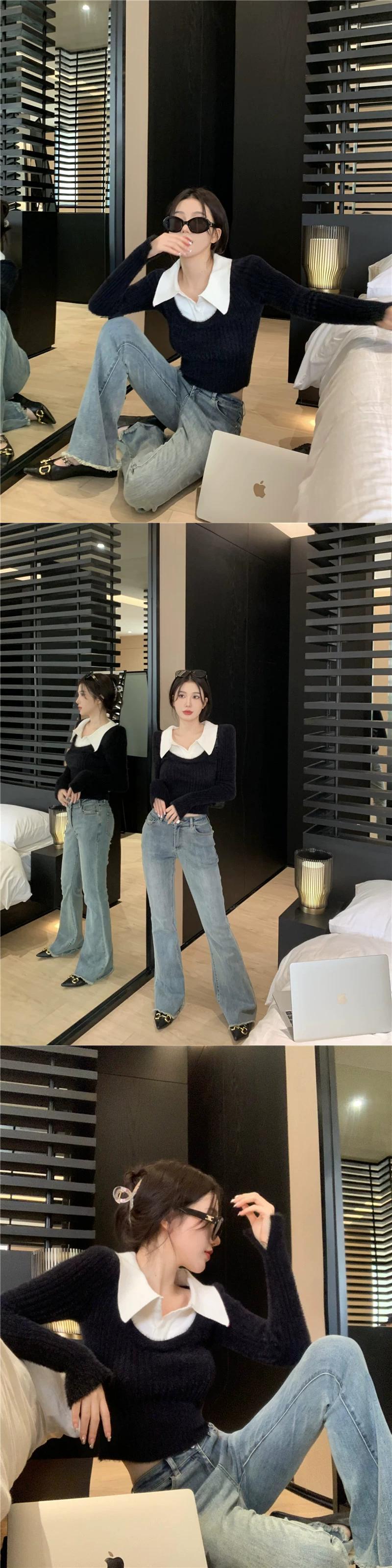 ニッチオールマッチファッショナブルなポロカラー長袖ニットセーター女性の 2023 春の新作模造ミンクファーフェイクツーピースセーター ロング スプリング 春物 0921929414050908