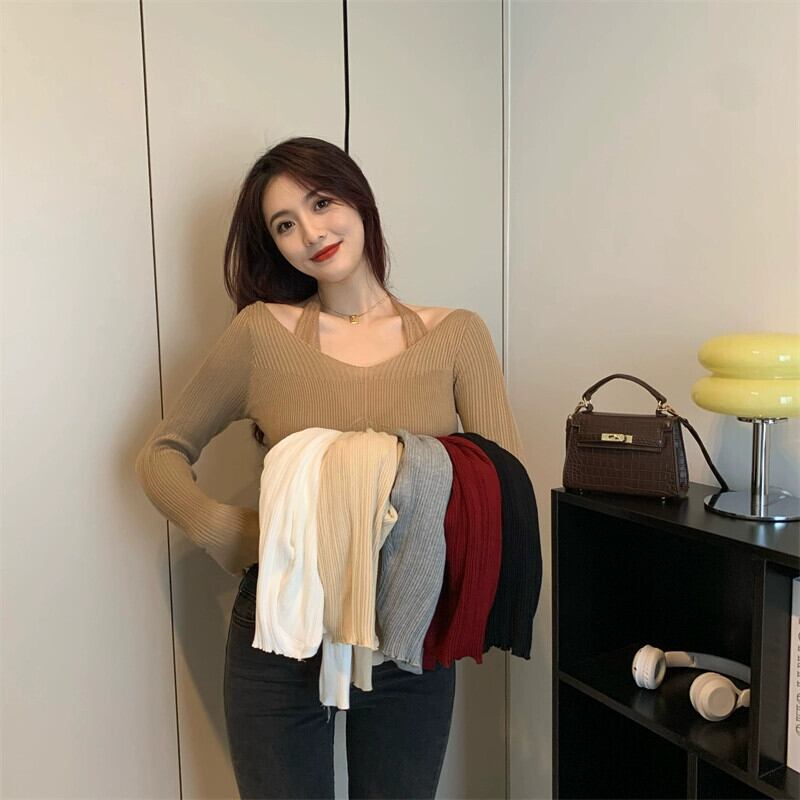 黒の V ネック長袖ニットセーター女性の春の気質ハンギングネックボトリングシャツデザインセンスニッチスリムショートトップ ロング ブラック スプリング 春物 Vネック 092198388713771