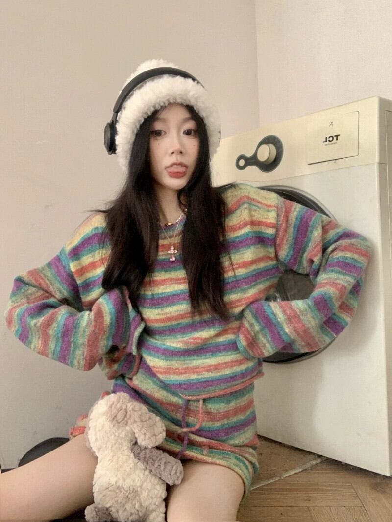 バージョンのフライドストリートファッションストライプスーツ女性の 2023 春の新作薄セクションセーターバッグヒップスカート 2 点セット スプリング 春物 0921982837510255