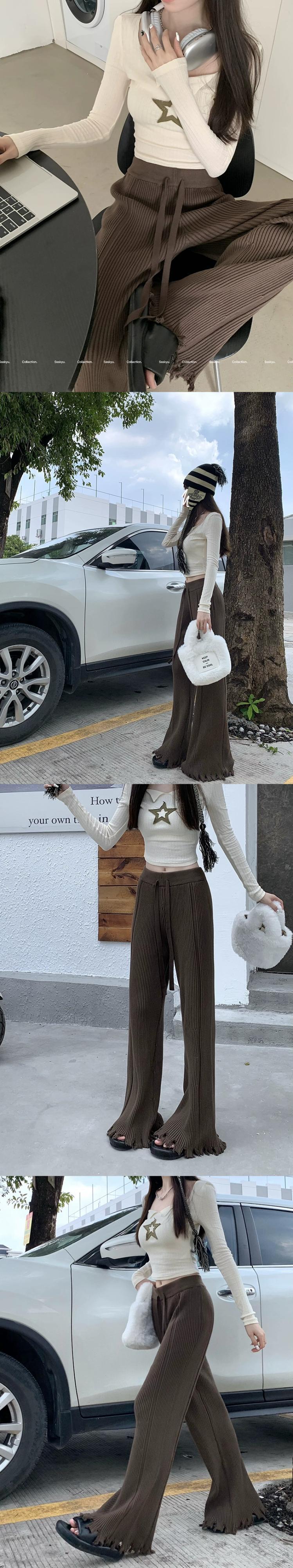 シックなフリンジ付きフリンジ付きニットカジュアルパンツレディース春秋ハイウエスト痩身オールマッチワイドレッグパンツフレアパンツ ハイウェスト レッド スプリング 春物 オータム 秋物 0921988285472796