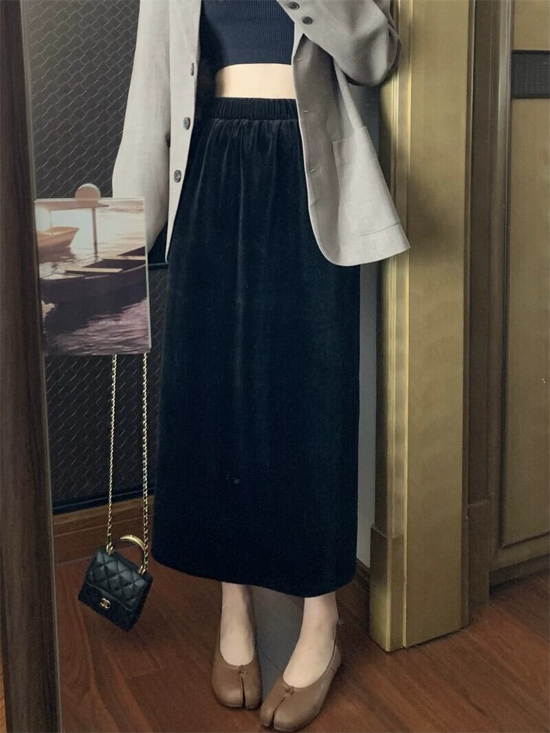 レトロハイウエストベルベットスカート女性の春と秋 2023 新しいベルベット肥厚オールマッチ痩身スリットリトルブラックドレス ハイウェスト スプリング 春物 オータム 秋物 0921974755141552