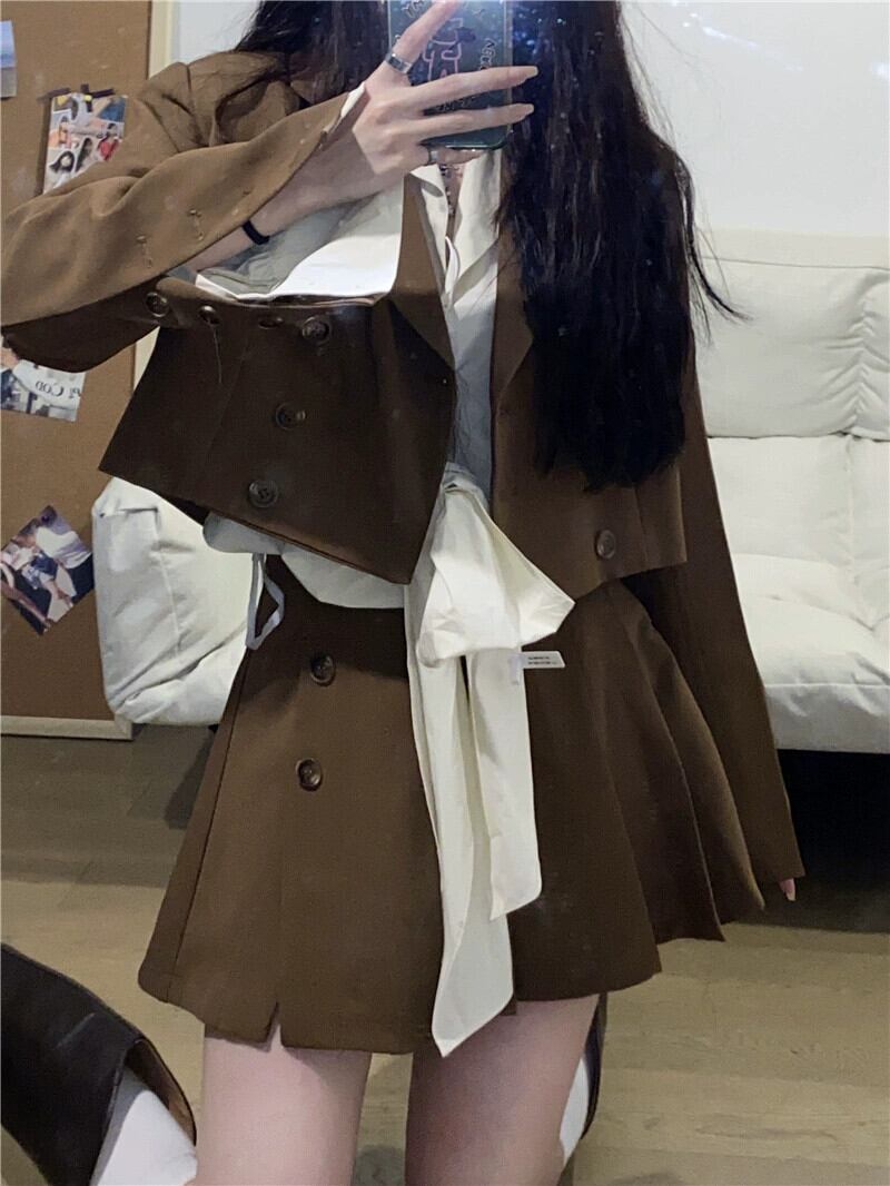 バージョンのフライドストリートスーツスカート女性春 2023 新しい弓シャツスーツプリーツスカートスリーピーストレンディ リボン スプリング 春物 0921947150000621