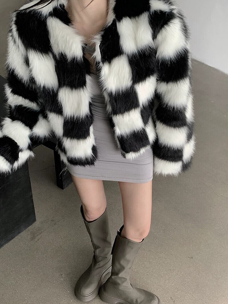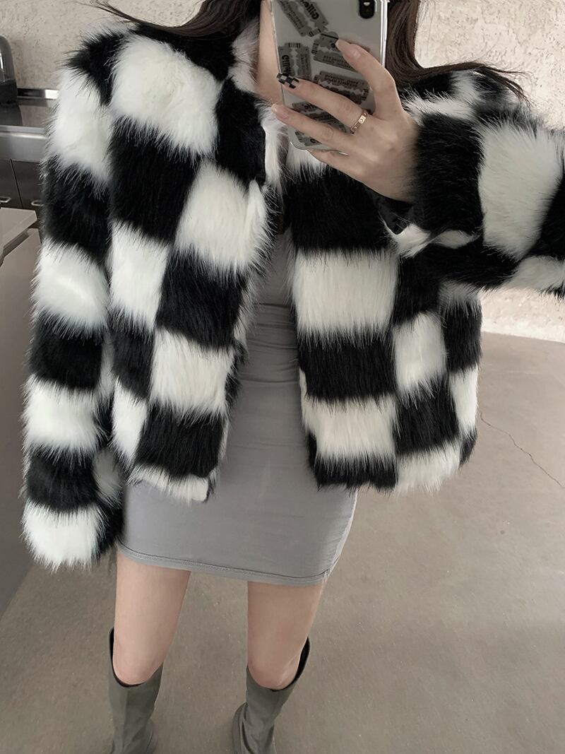 インターネットセレブファッショナブルなコントラストカラーチェッカーボードコート女性の冬 2023 新しい綿プラス厚いルーズイミテーションミンクベルベットカーディガン コットン ウィンター 冬物 0921999863958721