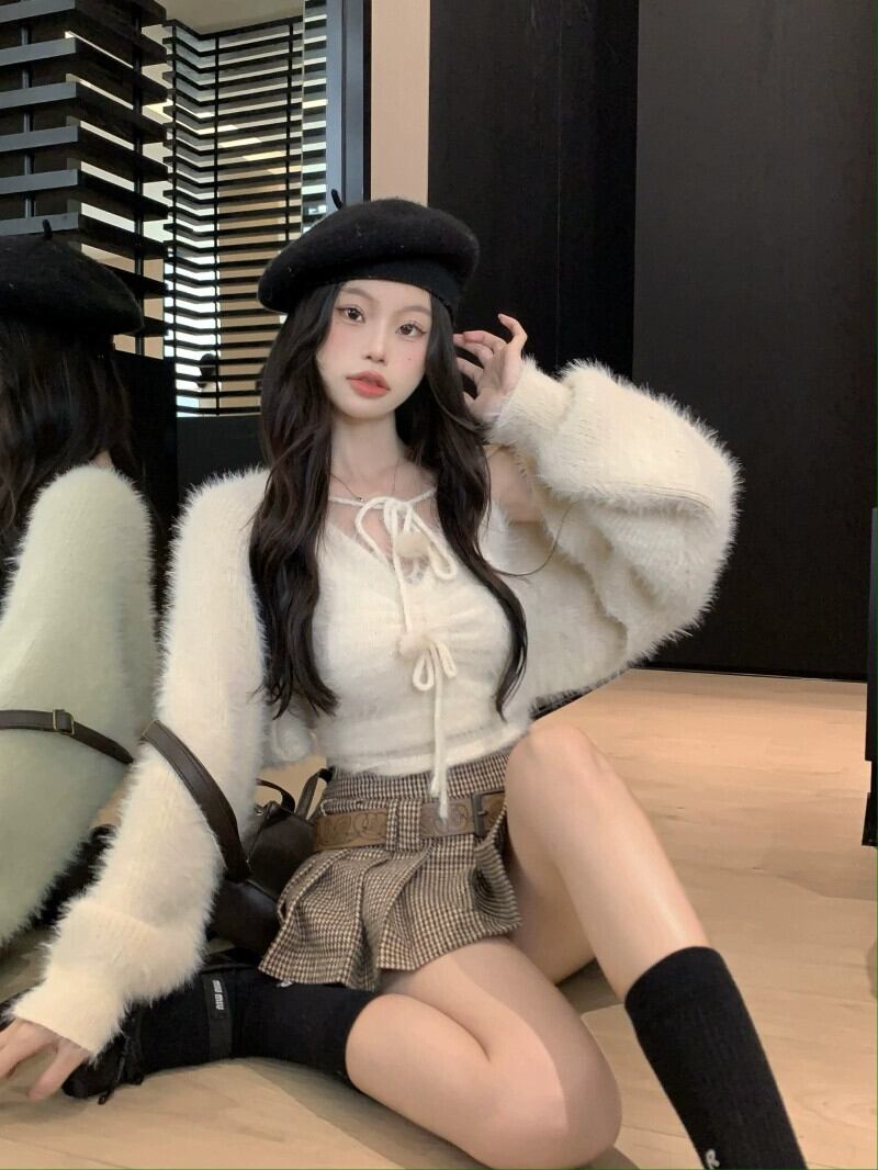 純粋な欲望模造ミンクベルベットスーツ女性の春と秋 2023 新しいシャーリング薄いキャミソールショートブラウスツーピーストレンディ スプリング 春物 オータム 秋物 0921933400431671