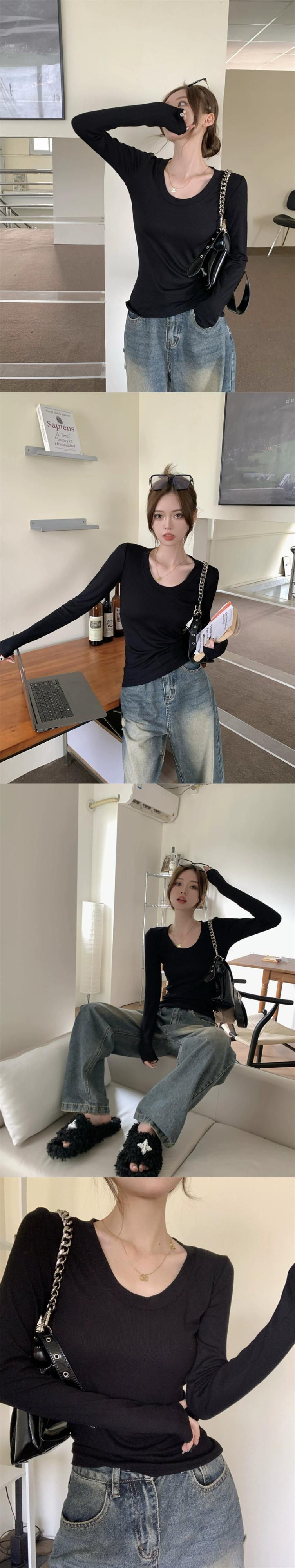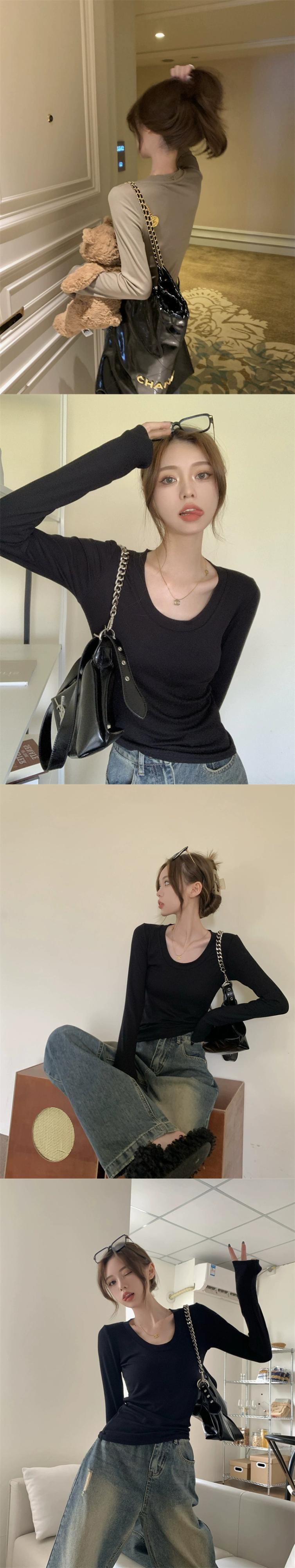 オールマッチUネック長袖Tシャツレディース2023春新作無地シンプルバージョンのスリムで薄いボトムストップス ロング スプリング 春物 ソリッドカラー 0921942491029770