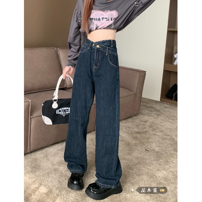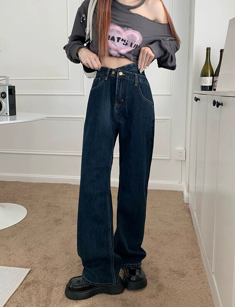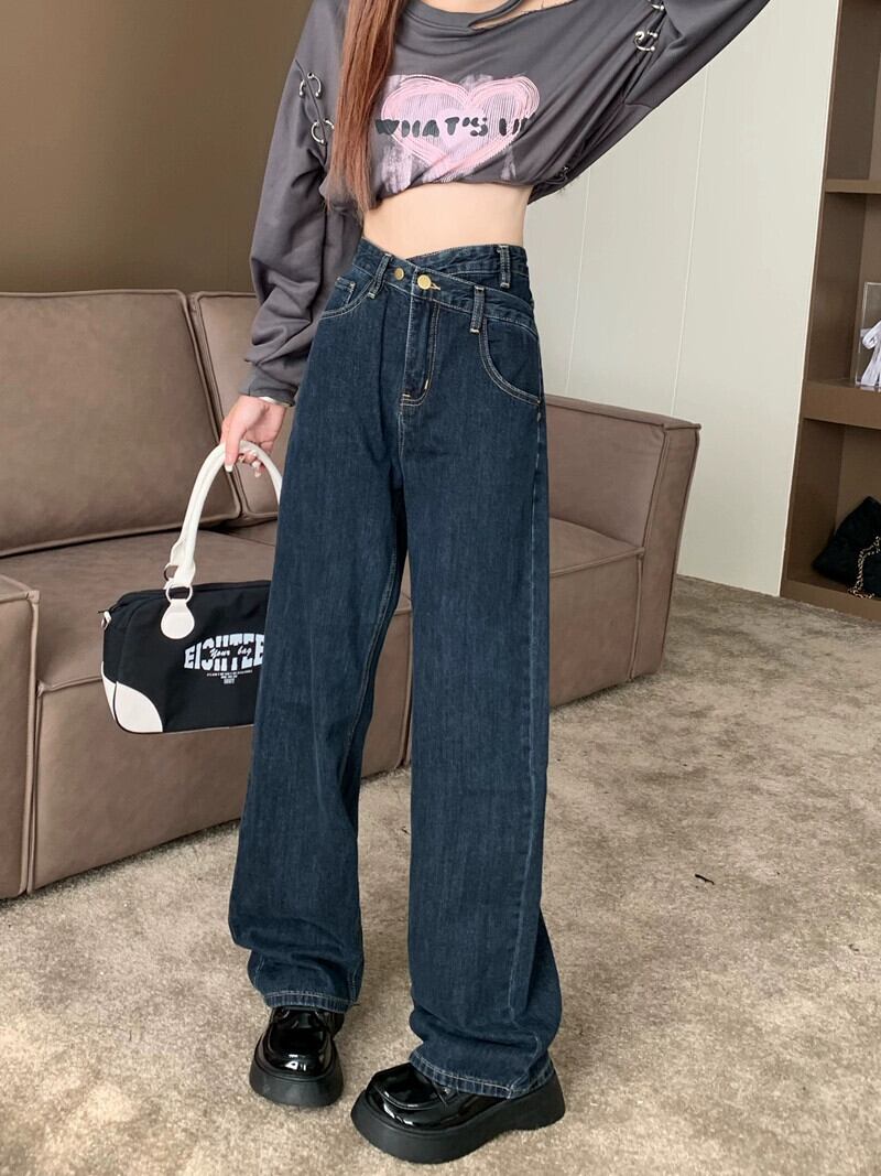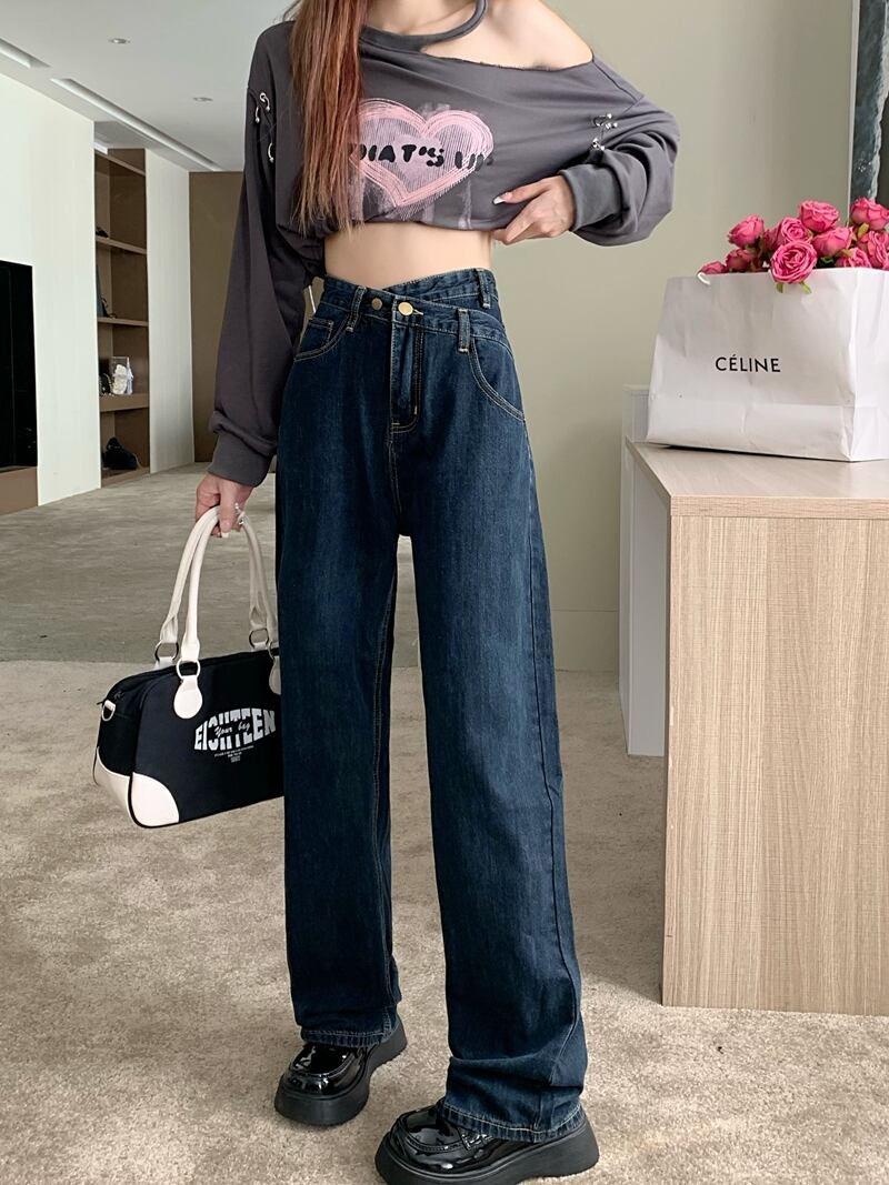 レトロダークブルージーンズ女性の夏のハイウエストストレートパンツインハイストリートワイドレッグパンツルーズパンツ ハイウェスト サマー 夏物 ワイドパンツ 0921924716374468