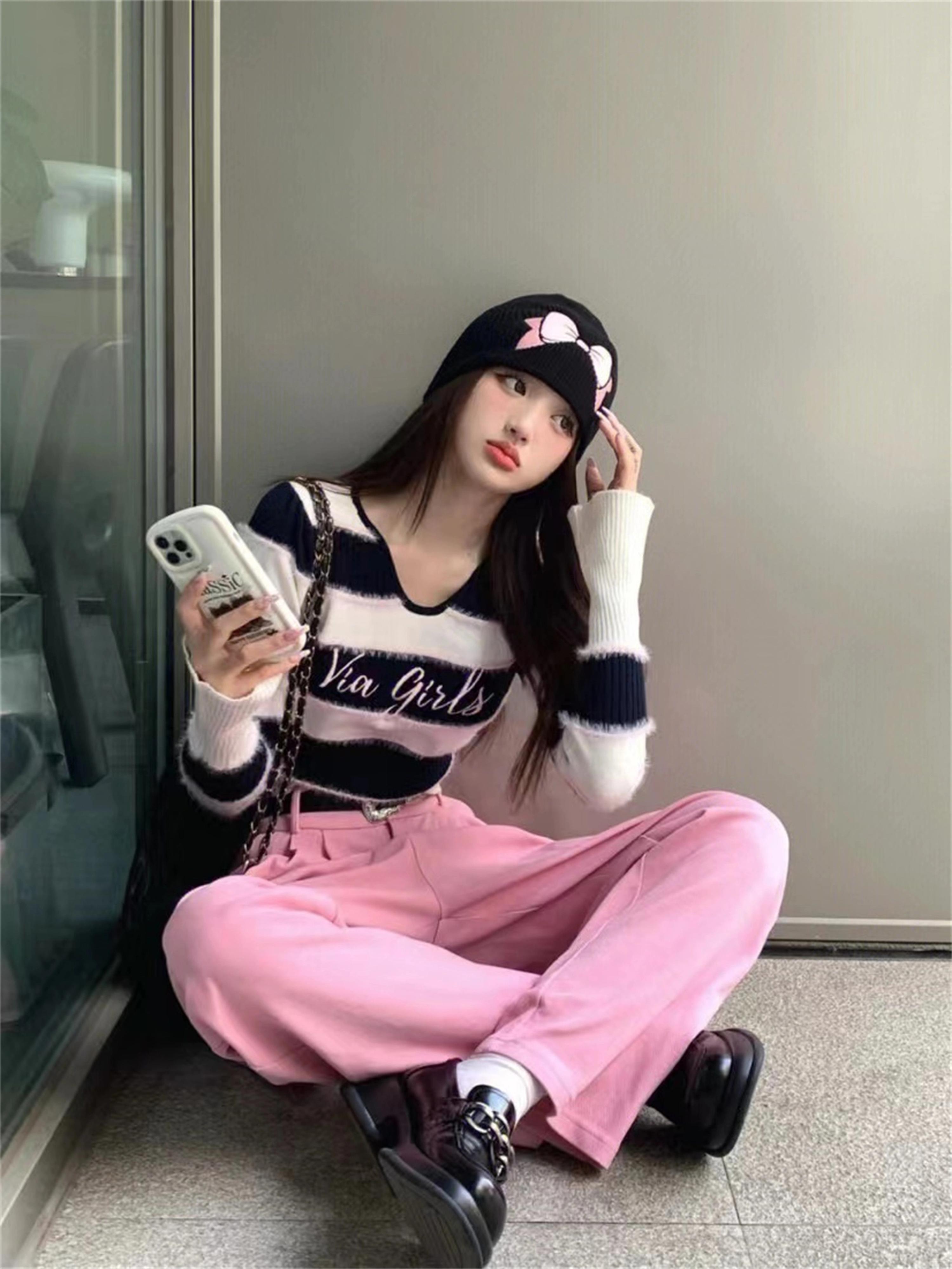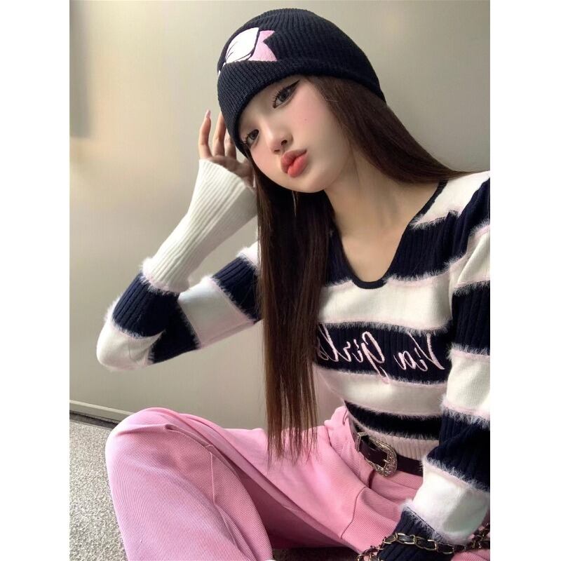 センスカラーコントラストストライプ V ネックプルオーバーセーターレディース 2023 春の新作オールマッチスリムショートニットトップ スプリング 春物 Vネック 0921970231161264